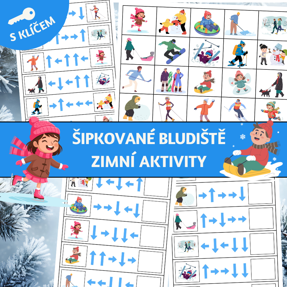 Děti sledují směr šipek v bludišti, plánují svou cestu krok za krokem a na konci přiřazují správnou kartu se zimní aktivitou.