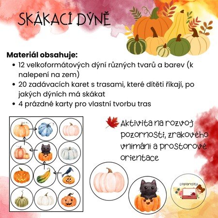 Děti skáčou po dýních podle zadání na kartě, čímž rozvíjejí pozornost, paměť, orientaci na ploše i schopnost řídit se instrukcemi.
