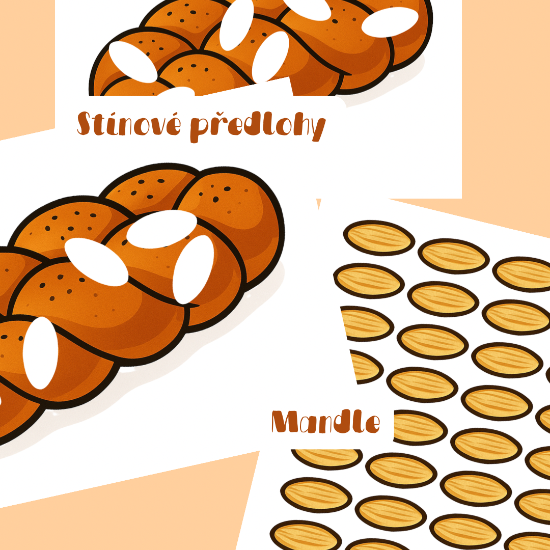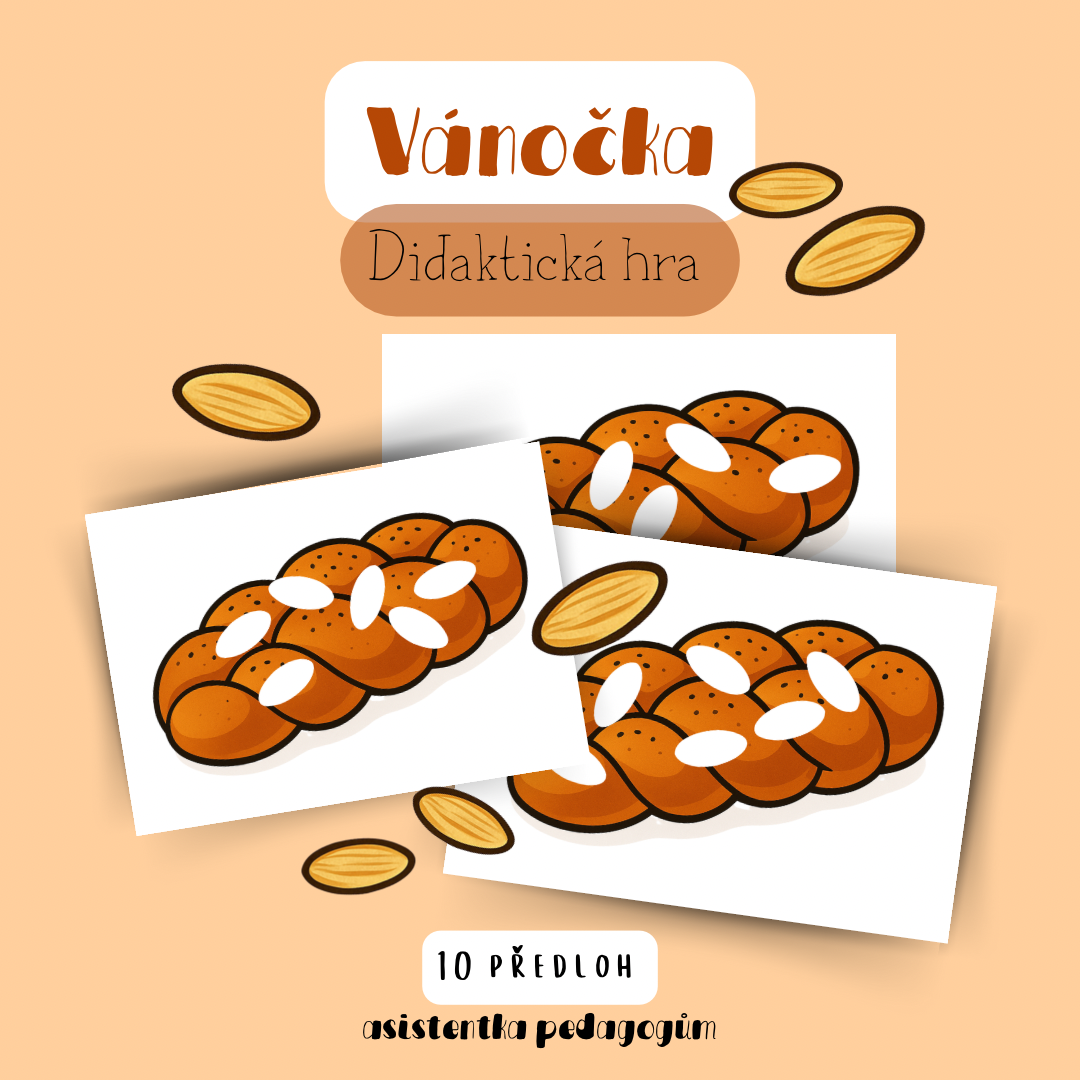 • Didaktická hra zaměřená na rozvoj jemné motoriky, zrakového vnímání, soustředění a logického myšlení. Děti skládají barevné mandle na vánočku podle stínů na předloze.