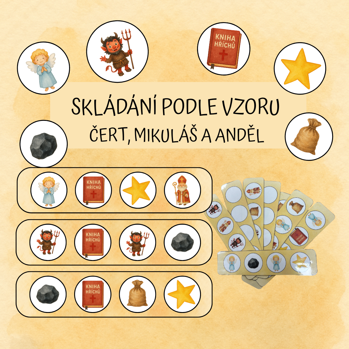 Na jedné kartičce jsou obrázky (např. čert, Mikuláš, anděl, pytel), na druhé stejné kartičce jsou prázdná kolečka.
