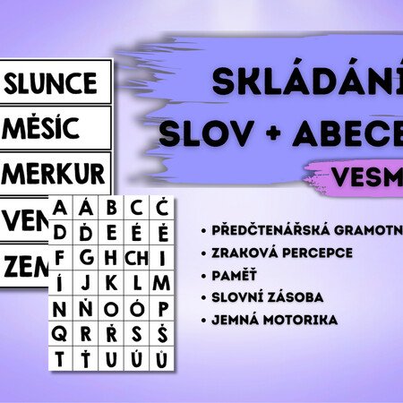 Soubor obsahuje 6 stran - (4 strany s obrázky a slovy + 2 strany abecedy) a slouží k procvičování slovní zásoby, předčtenářské gramotnosti, paměti, jemné motoriky.