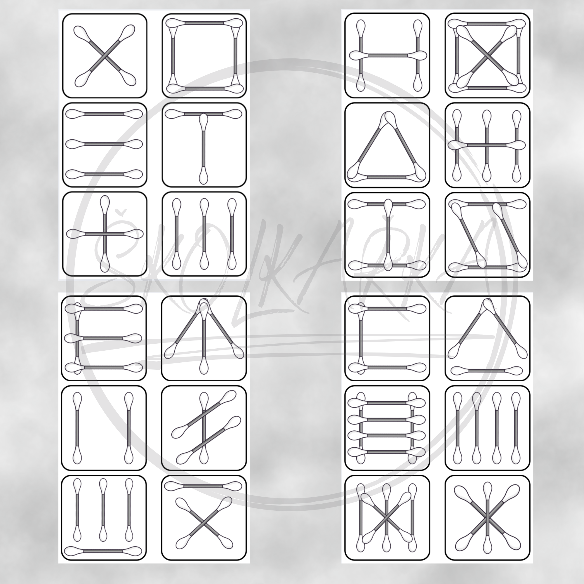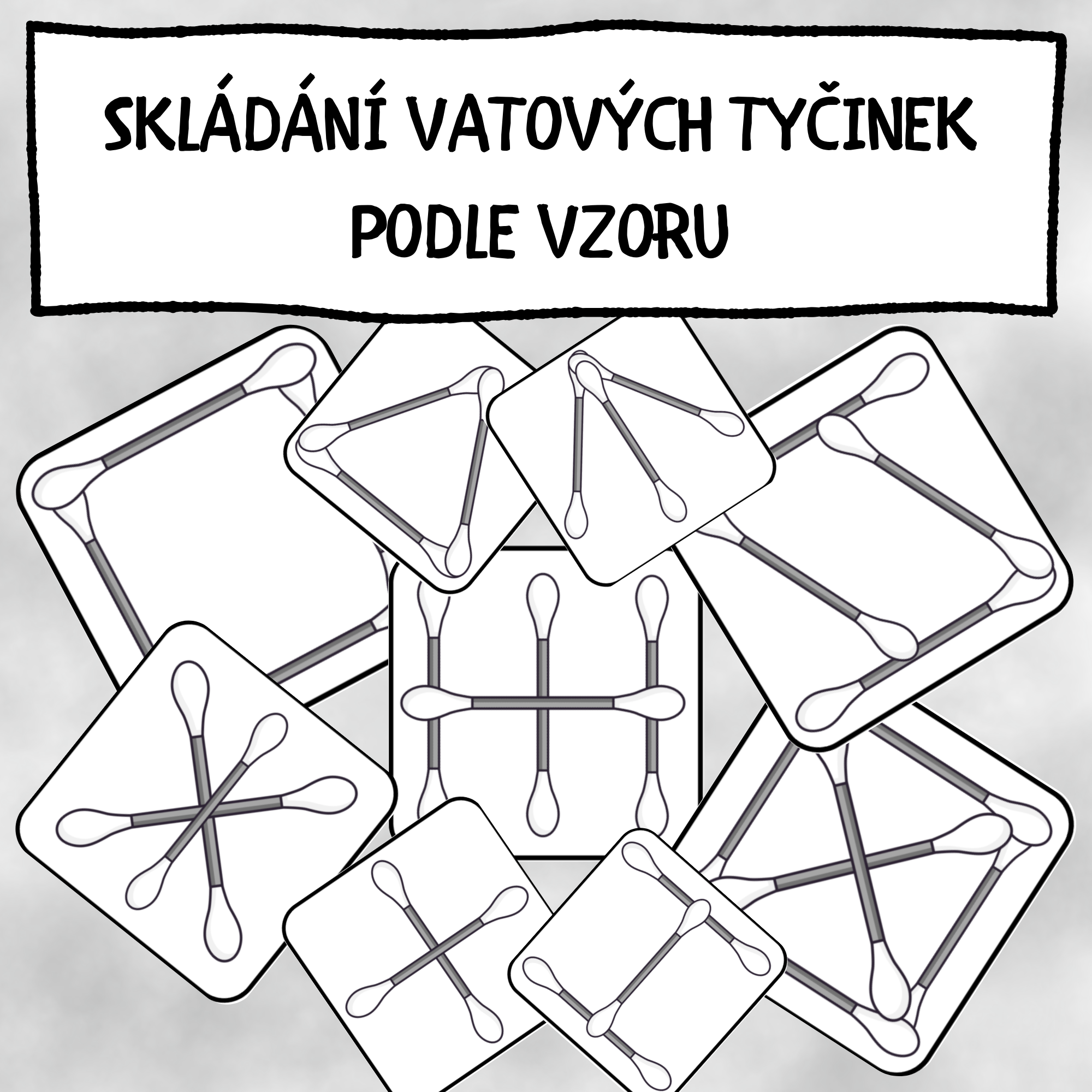 Tento vzdělávací materiál spočívá ve skládání vatových tyčinek podle předlohových kartiček. Děti se snaží co nejpřesněji napodobit obrázek, který vidí na kartičce a vytvářejí různé obrazce.
