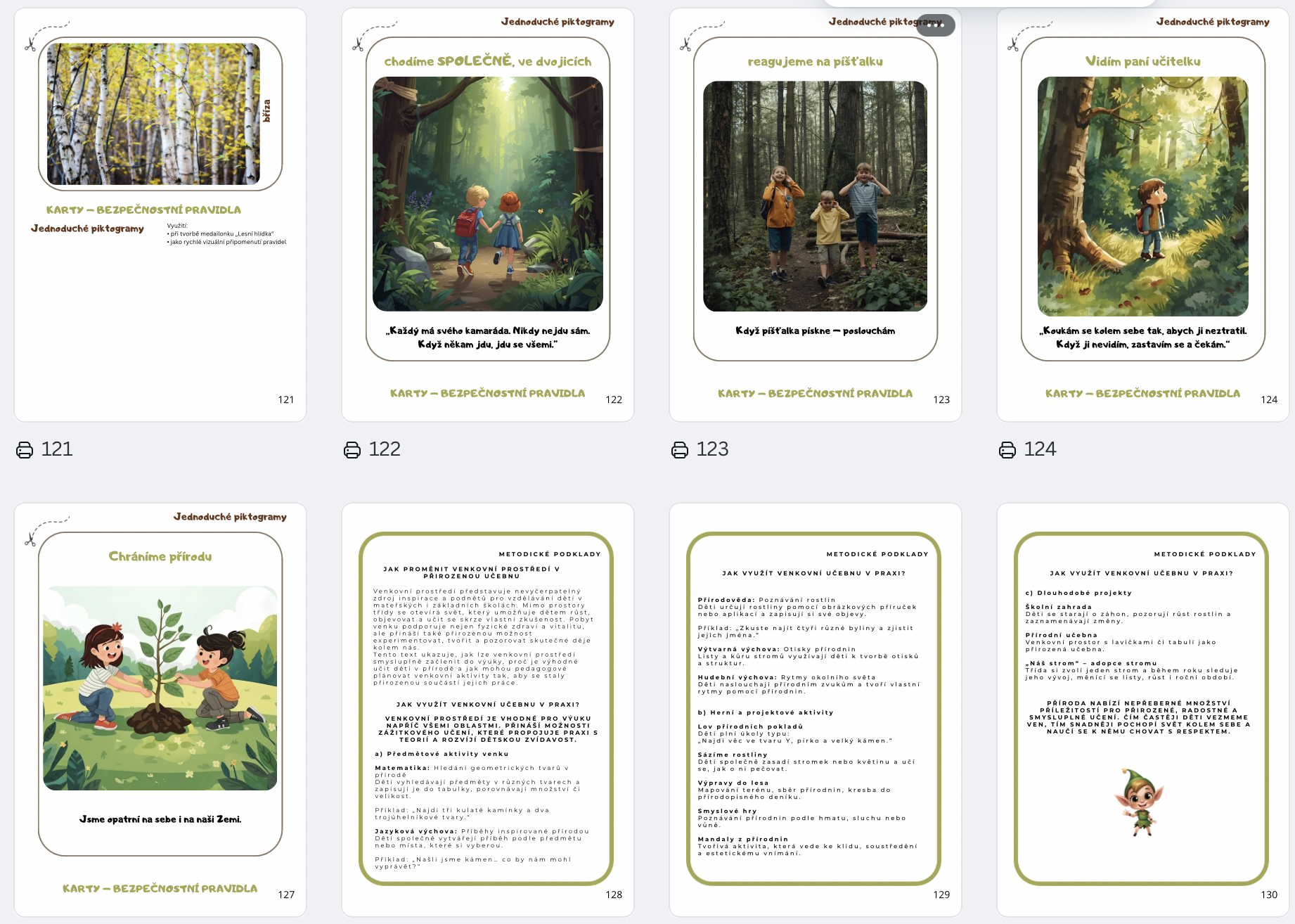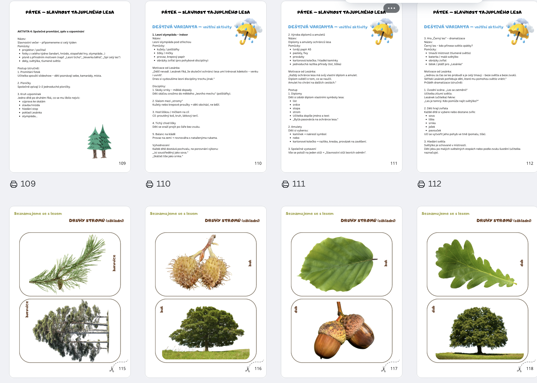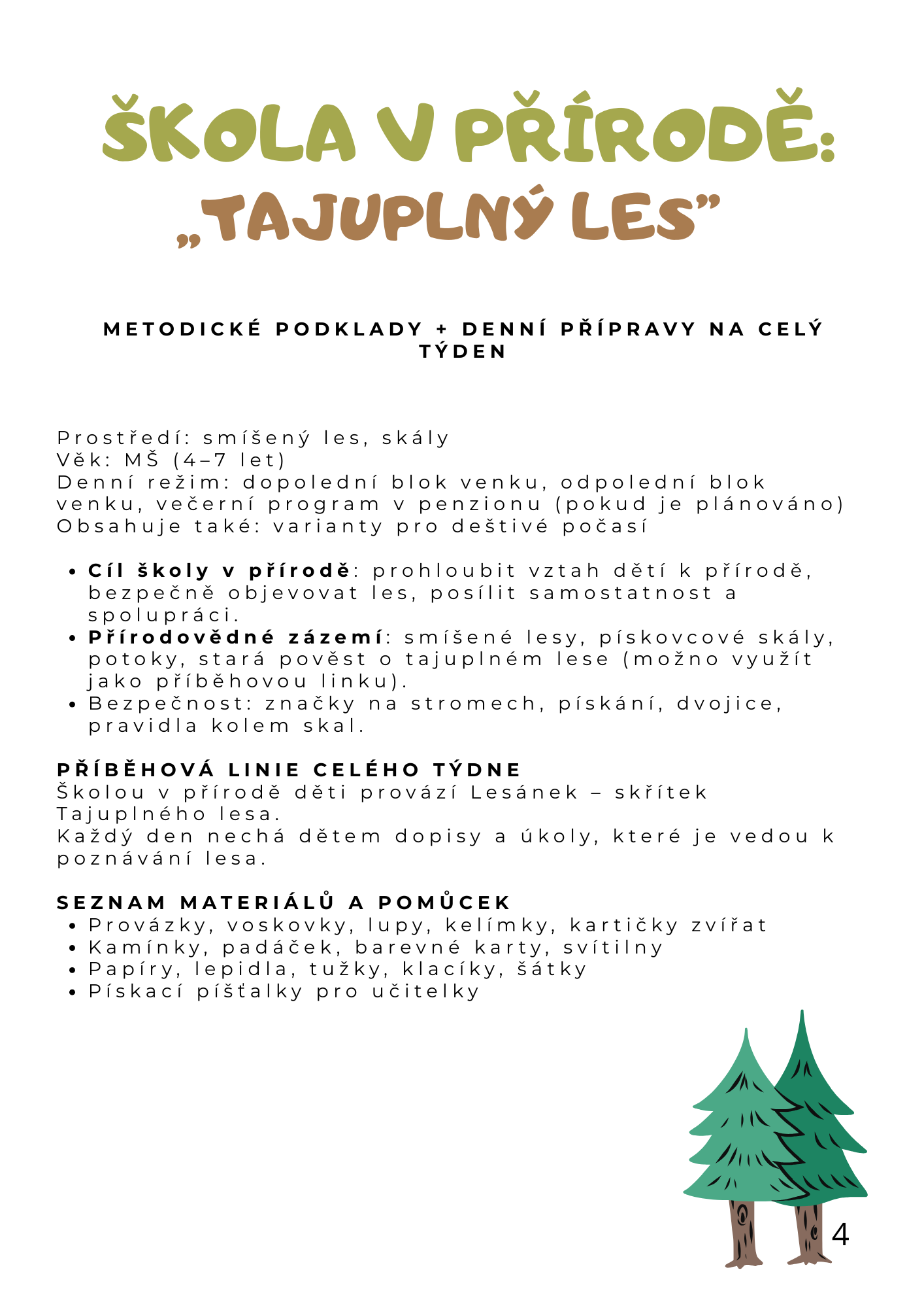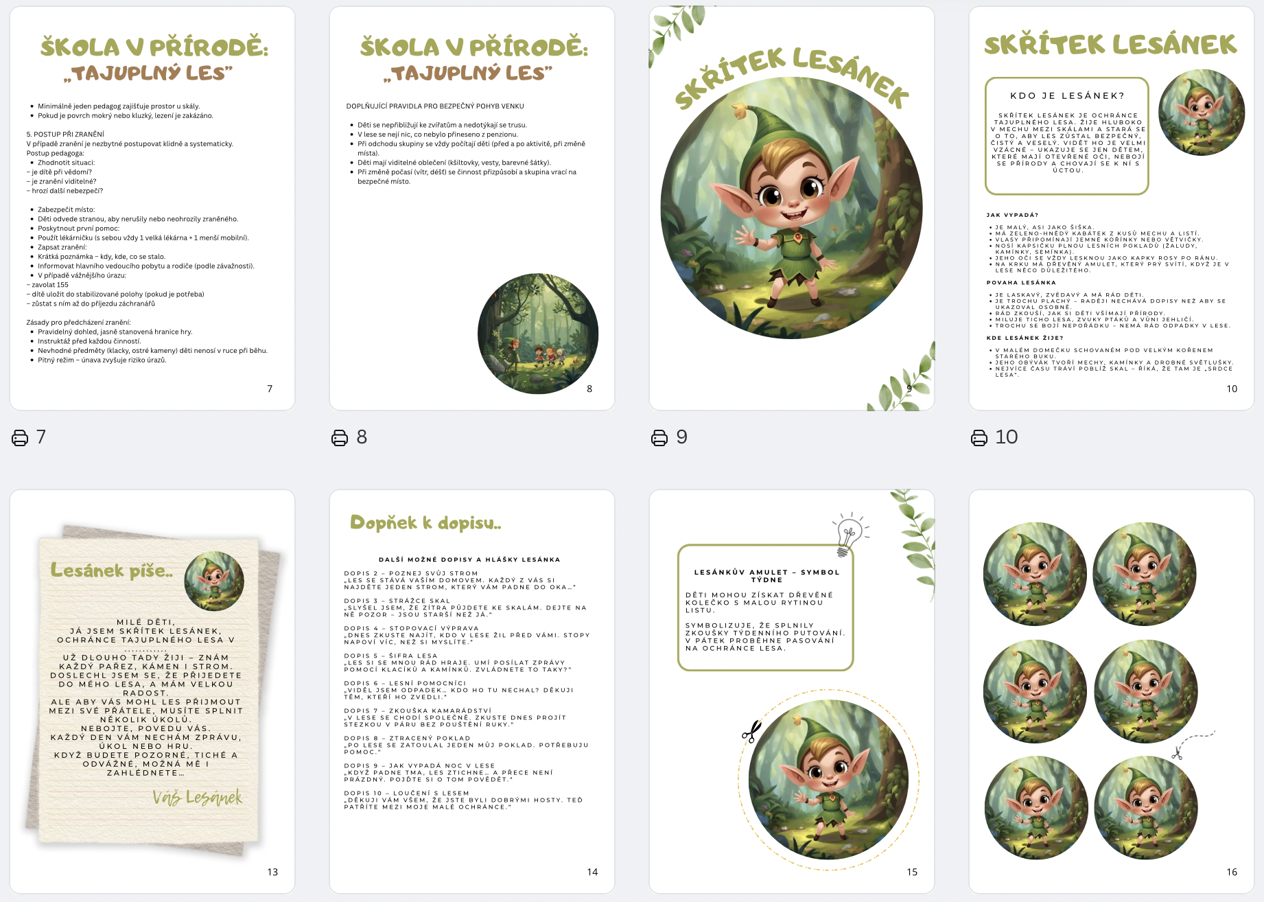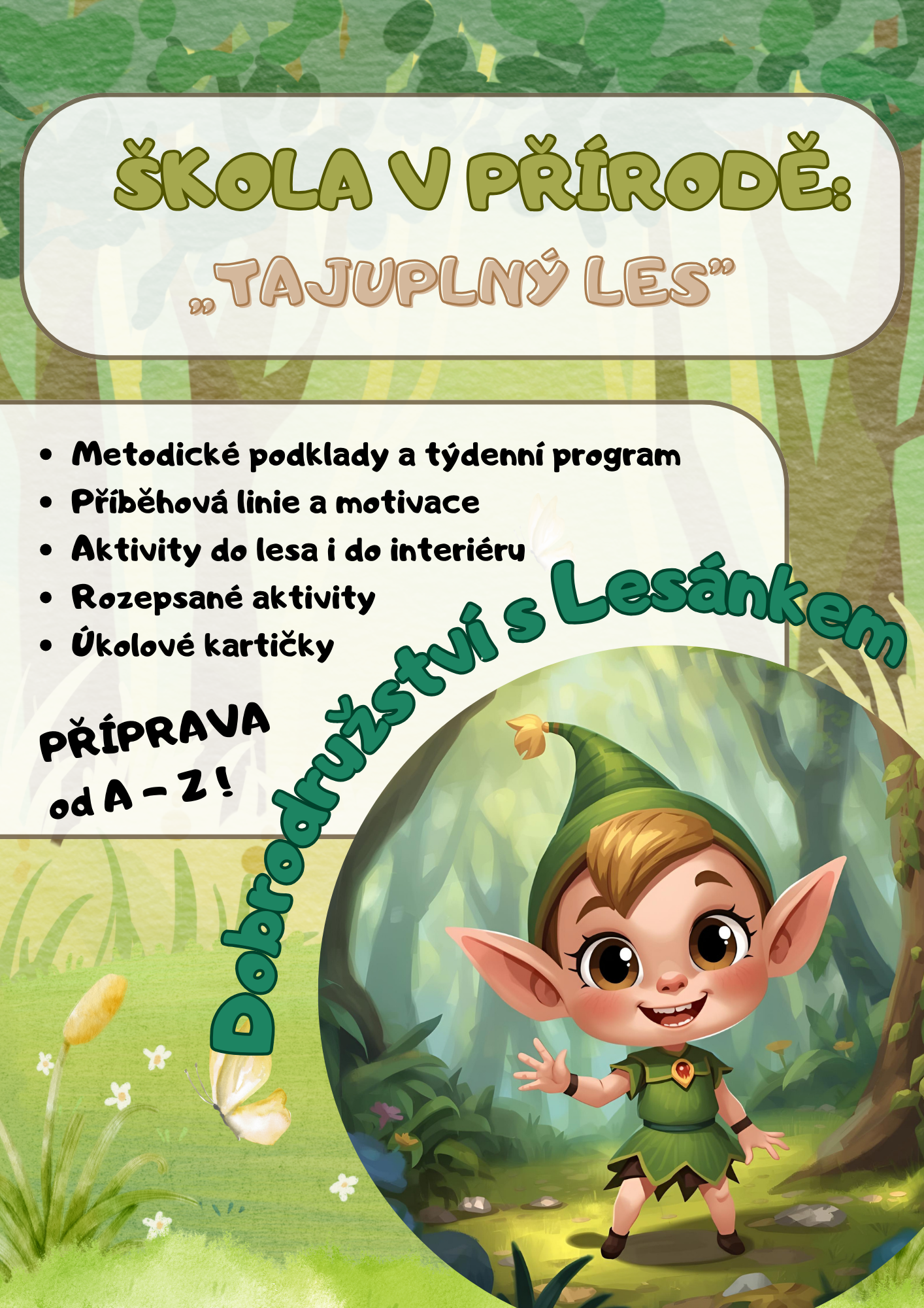 Kompletní metodický soubor Tajuplný les – škola v přírodě (132 stran) nabízí ucelený týdenní program do MŠ i na 1. stupeň ZŠ. Najdete v něm denní plány, příběhovou linku se skřítkem Lesánkem, venkovní i deštivé aktivity, bezpečnostní pravidla, pátrací hru, lesní olympiádu a tiskové přílohy.