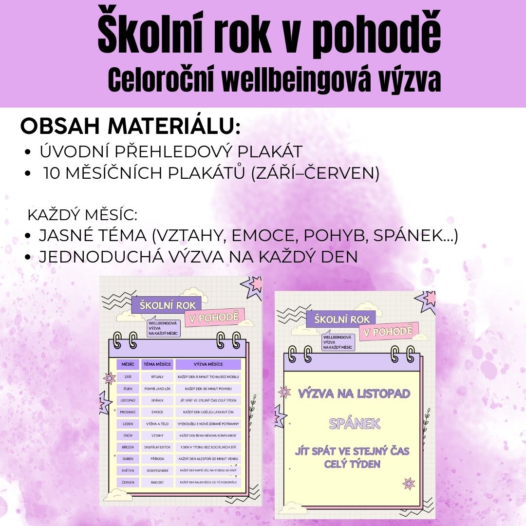 Školní rok v pohodě je wellbeingová výzva na celý školní rok s jasným měsíčním přehledem a jednoduchými úkoly pro každodenní práci ve třídě. Podporuje duševní pohodu, vztahy i bezpečné klima bez složité přípravy.
