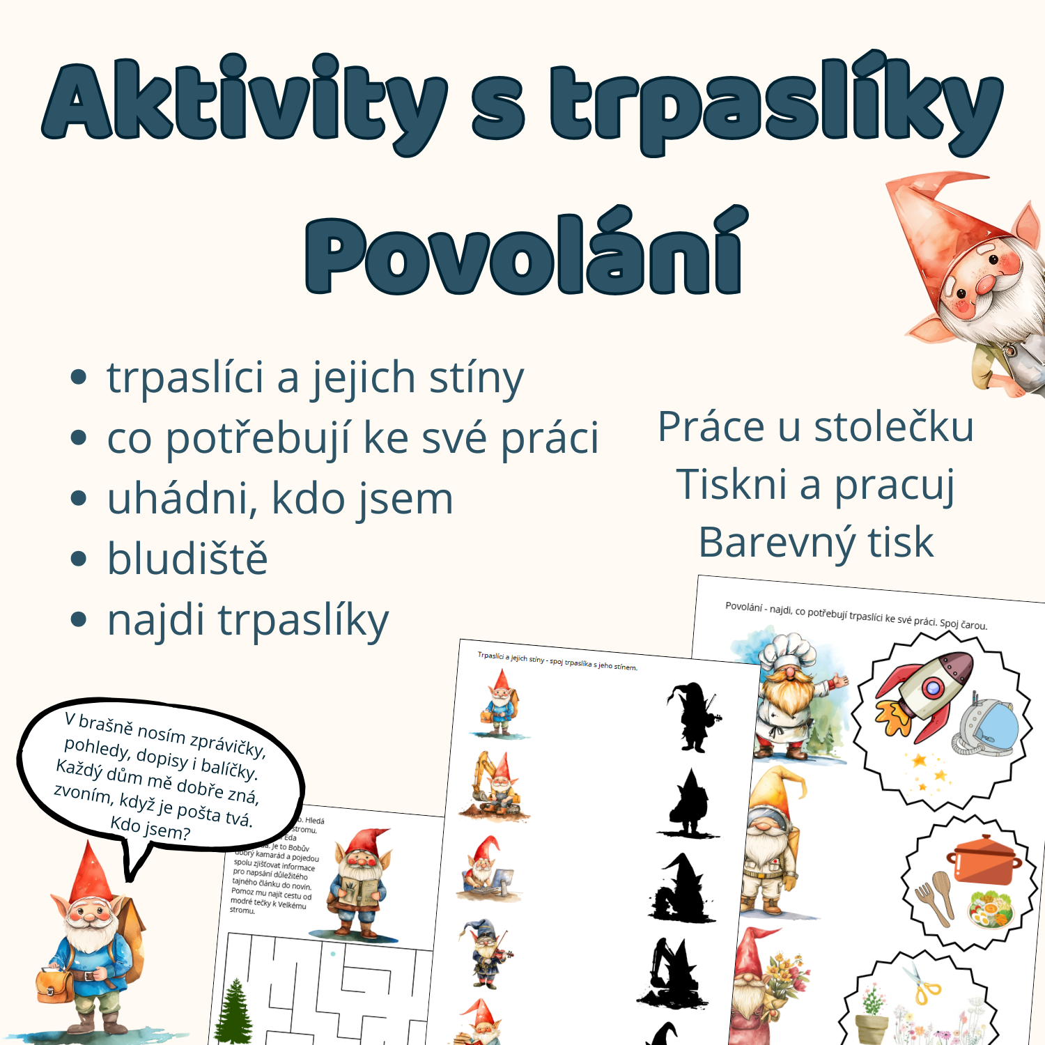 Vytvořila jsem hravý materiál s trpaslíky a jejich povoláním. Je vhodný pro malé děti, procvičí si díky němu zrakové vnímání, pozornost, slovní zásobu i prostorovou orientaci.