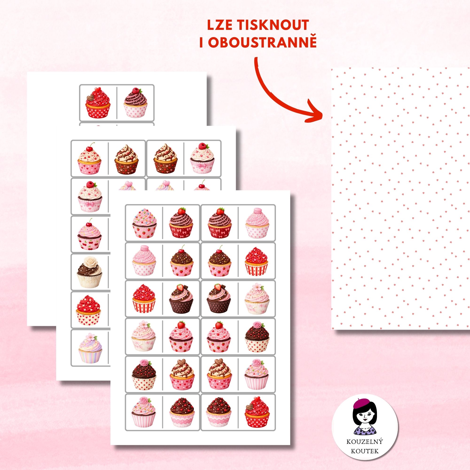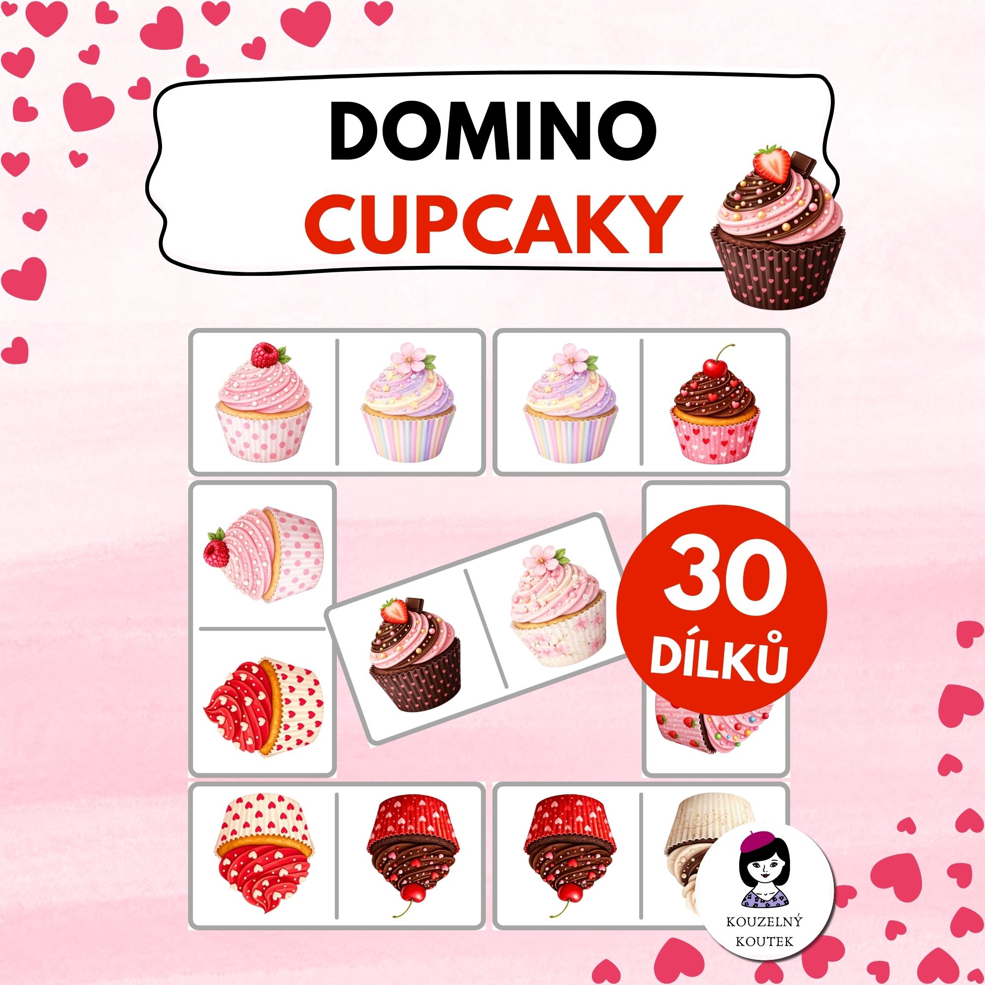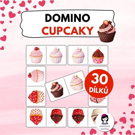 Domino je veselá a barevná hra. Obsahuje 30 barevných kartiček s obrázky cupcaků.