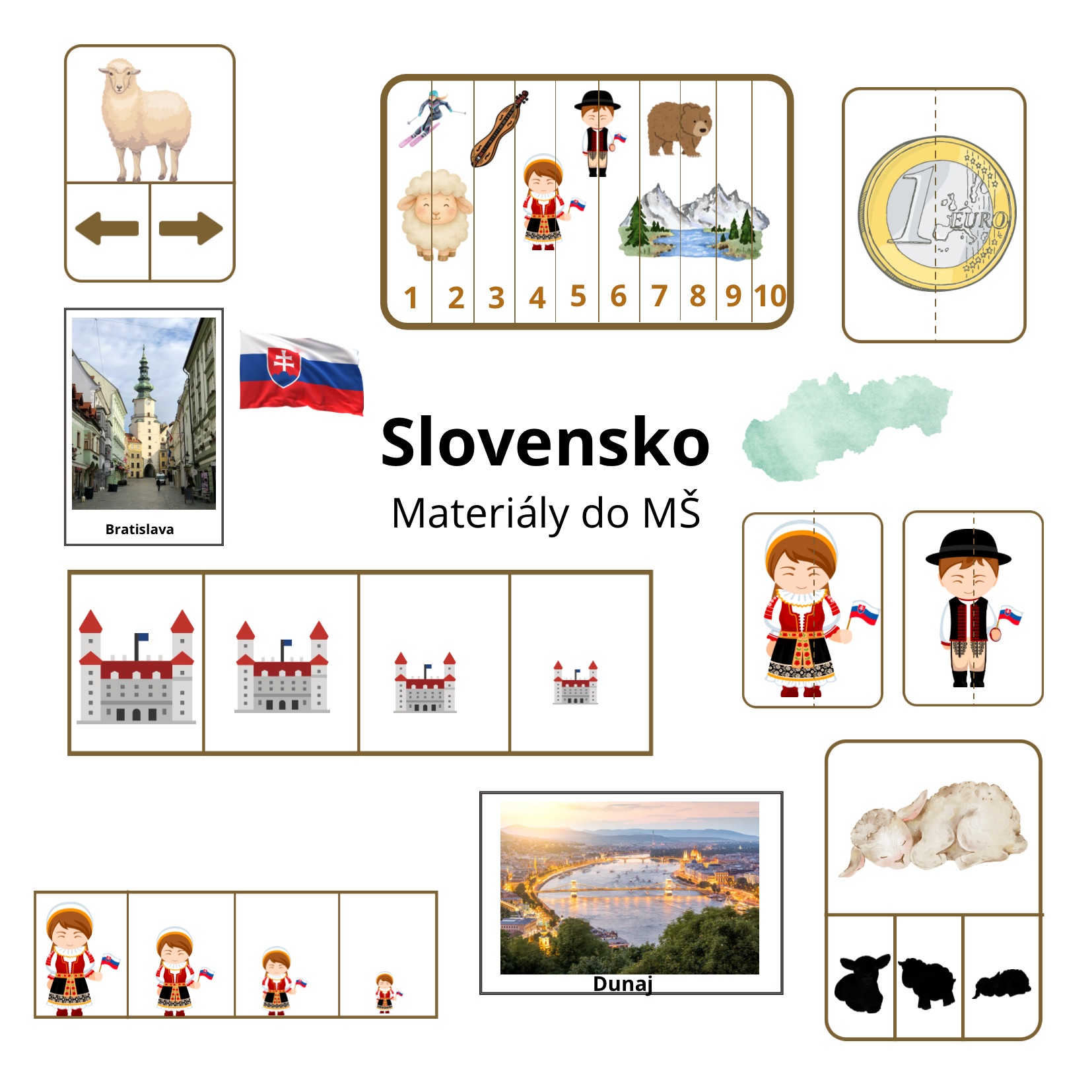 - Typické obrázky s popisem: poznávání slovenských symbolů, přírody a tradic.