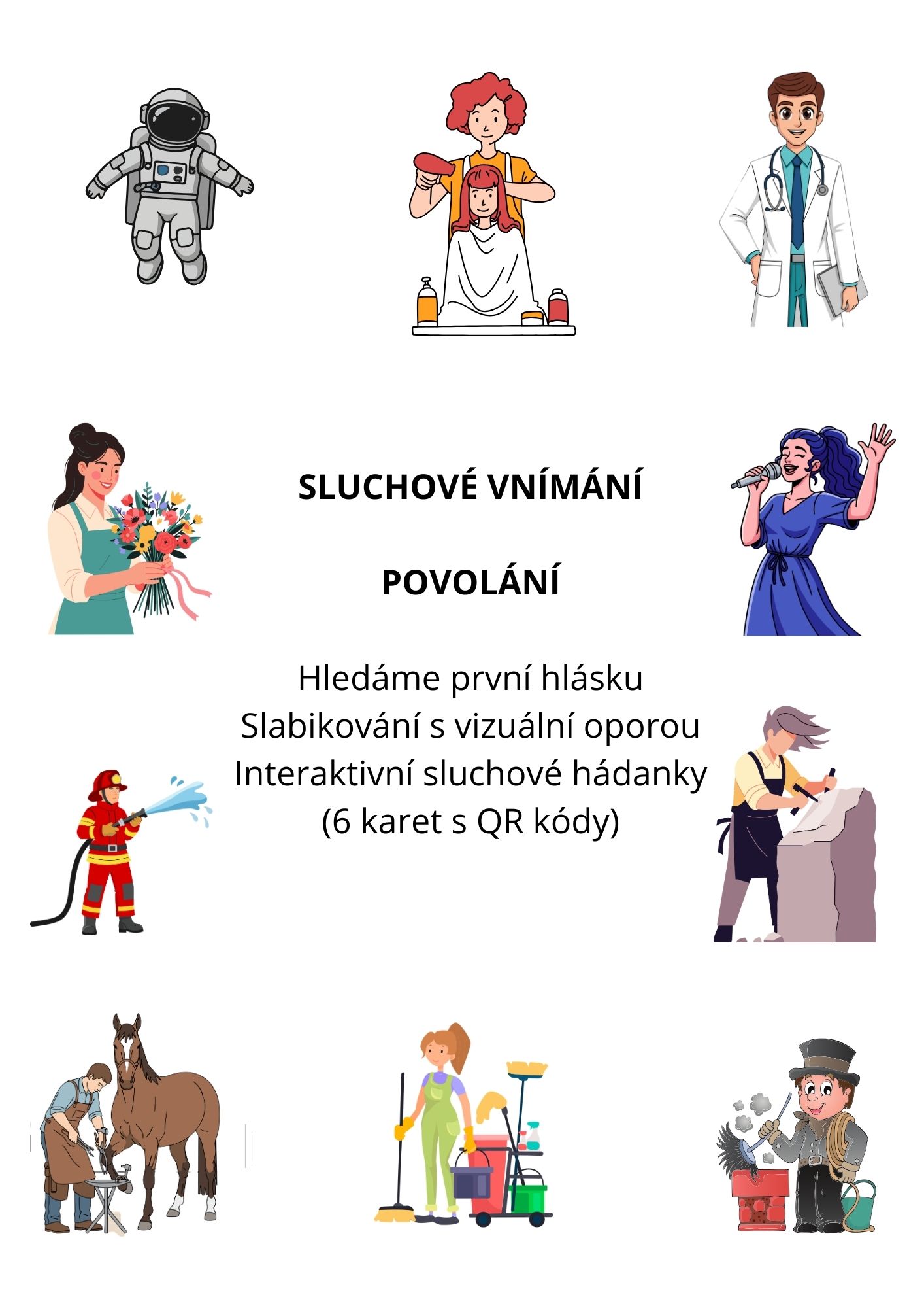 - Interaktivní sluchové hádanky (6 karet s QR kódy): Sada obsahuje 6 speciálních karet s obrázky povolání. Každá karta je opatřena unikátním QR kódem, který po naskenování přehraje typický zvuk daného řemesla. Děti tak trénují sluchovou diferenciaci a přiřazování zvukového vjemu ke konkrétnímu povolání. Karty jsou určeny k vystřižení, což učitelce umožňuje s nimi variabilně pracovat (např. v rámci center aktivit nebo skupinové práce).
