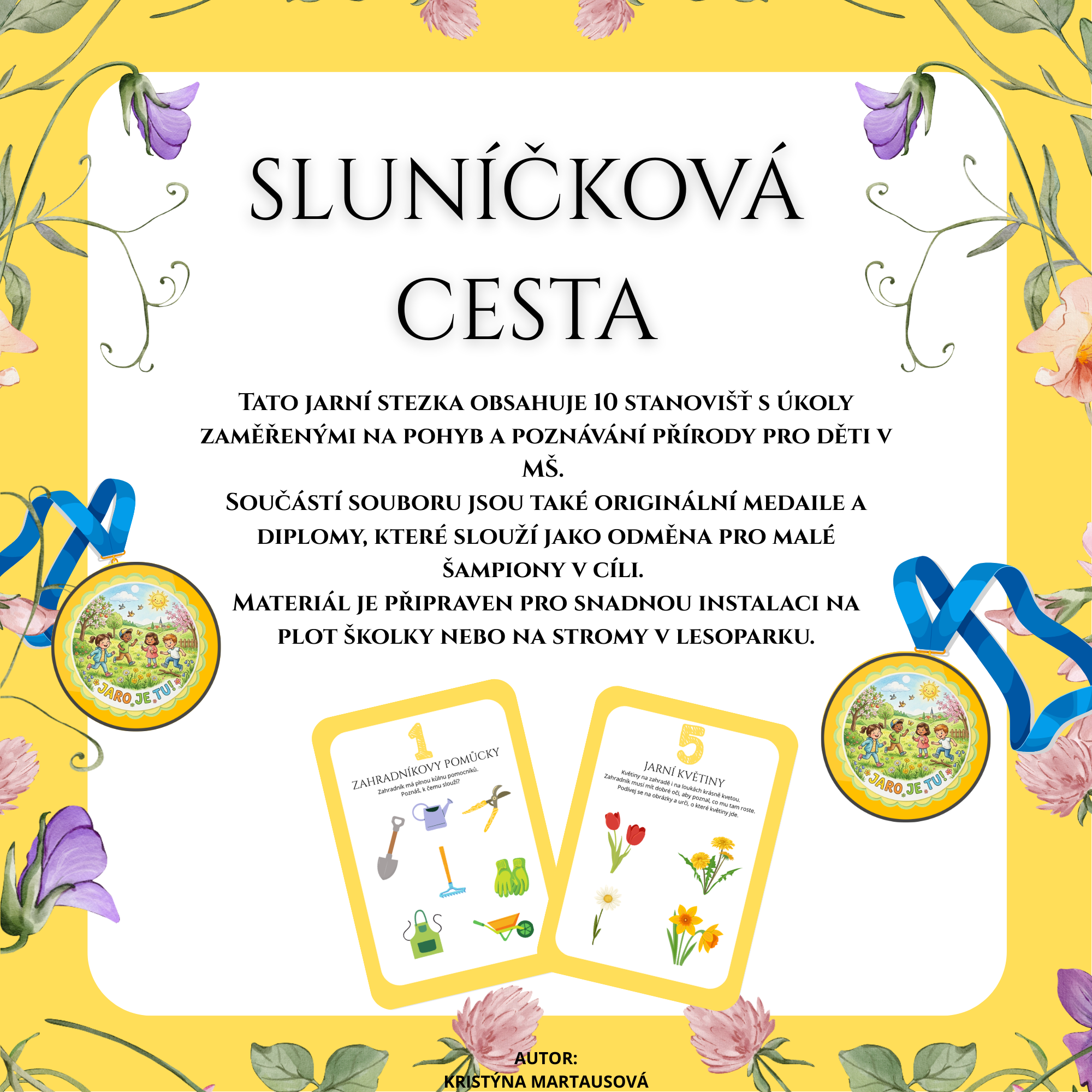 Tato kompletní sada aktivit je navržena pro děti předškolního věku a skvěle se hodí pro jarní dny na školní zahradě nebo v přírodě. Nabízí vyváženou kombinaci pohybu, poznávání a zábavy bez nutnosti dalších pomůcek.