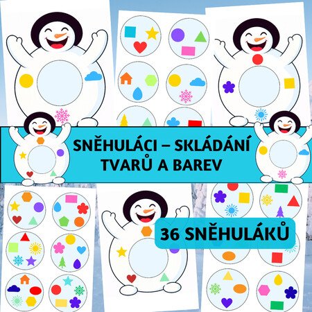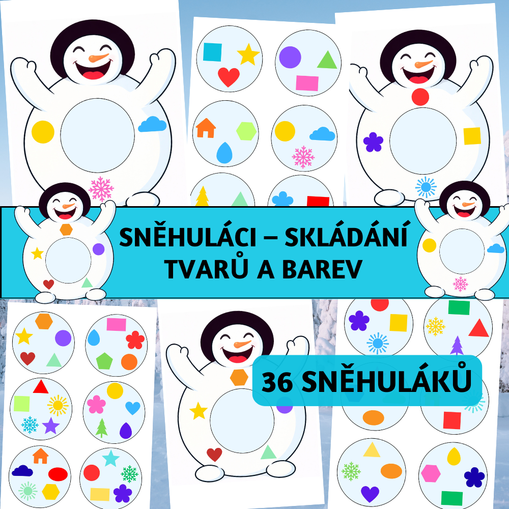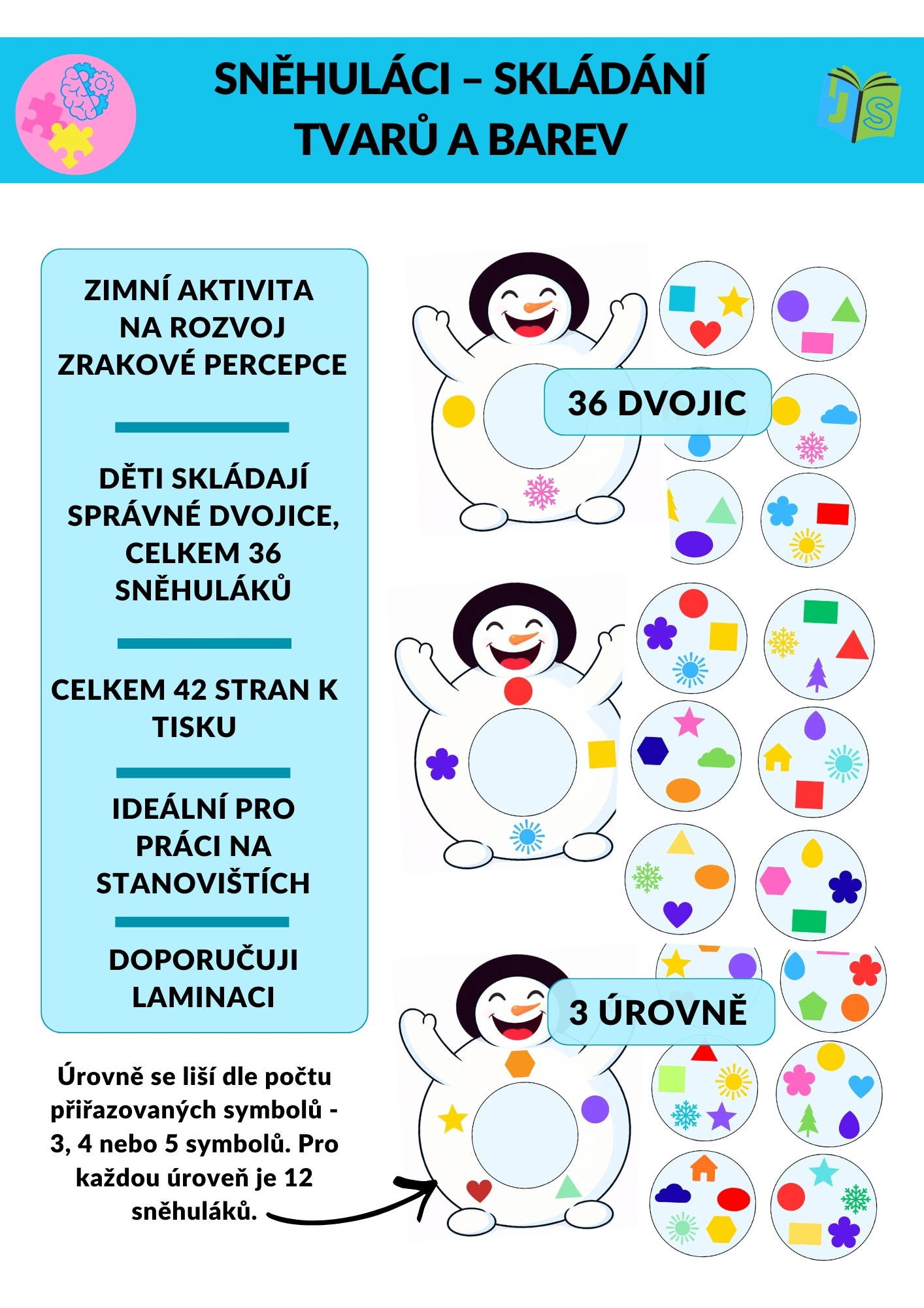 Zimní aktivita, která je ideální pro samostatnou práci dětí i centra aktivit. Děti skládají sněhuláky podle barev a symbolů, hledají správné dvojice. Aktivita je přehledná, hravá a díky několika úrovním obtížnosti ji snadno přizpůsobíte různým schopnostem dětí – ve stejné třídě i během roku.