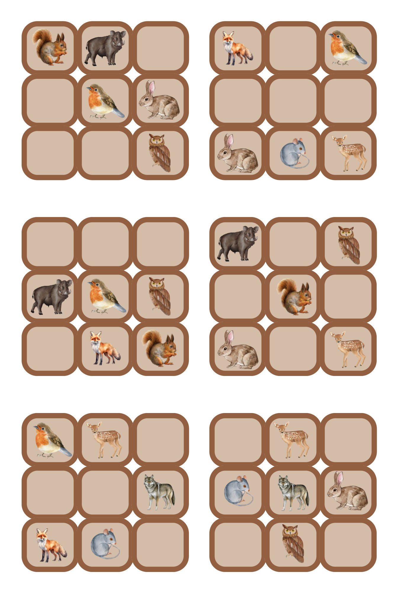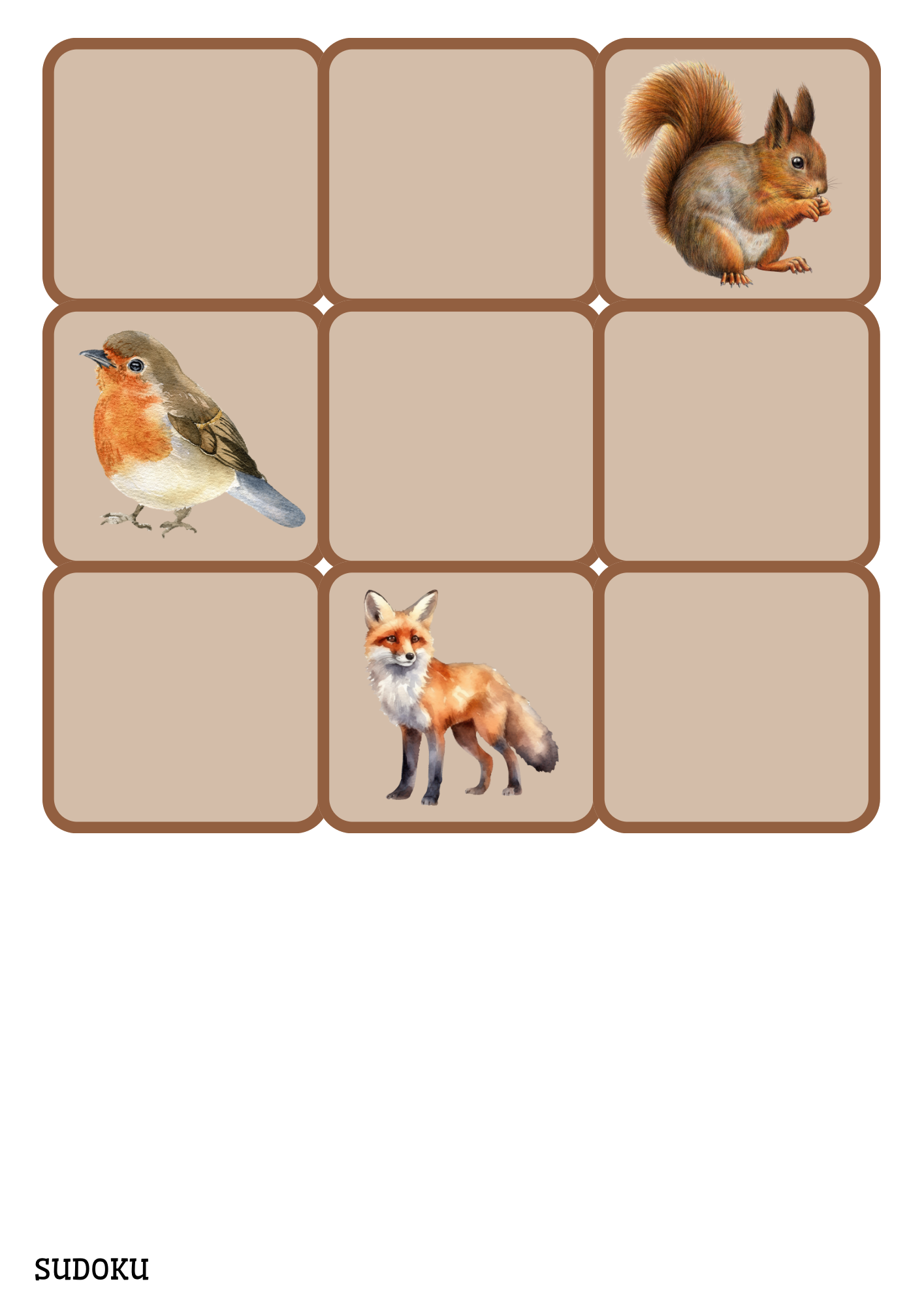 SUDOKU - děti doplňují zvířátka do mřížky tak, aby nebyla dvě shodná zvířátka ve sloupci ani řádku (4 sudoku, mřížka 3x3)