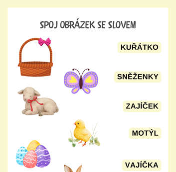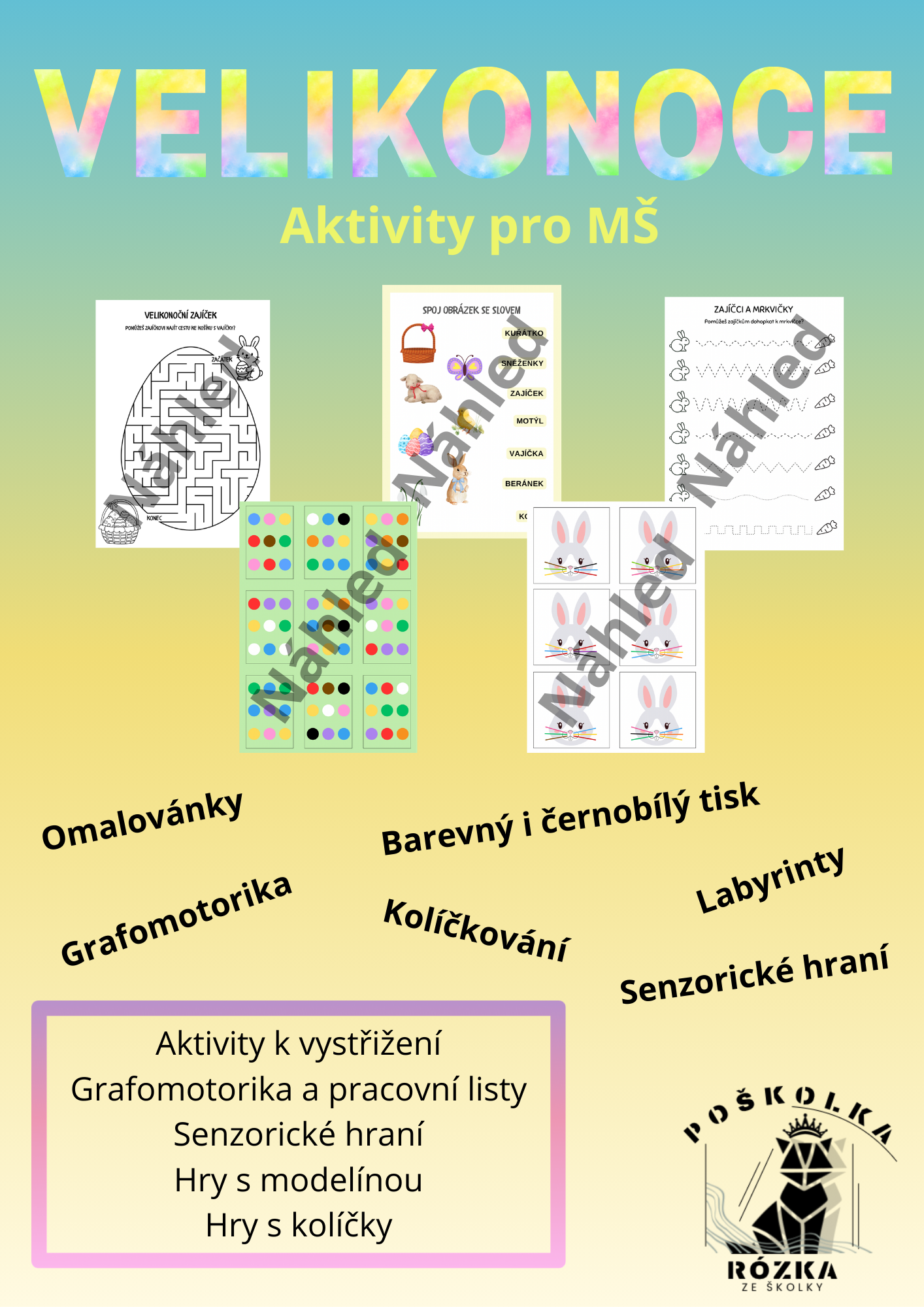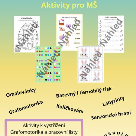 Materiál je souborem aktivit zaměřených do období Velikonoc. Vhodný pro barevný i černobílý tisk.