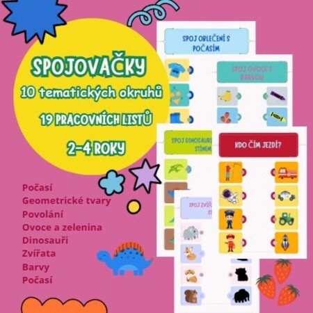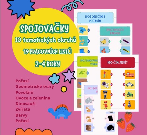 Sešit spojovaček je určený pro děti v doporučeném věku 2 až 4 let, ideální pro předškoláky. Obsahuje deset tematických okruhů, které děti vedou k propojování souvisejících prvků – od geometrických tvarů, přes povolání, ovoce a zeleninu, zvířata až po jednoduché rýmy a logické souvislosti.