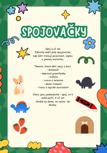 Sešit je vhodný do mateřských škol, na domácí procvičování i na cesty. Lze jej snadno zalaminovat a používat opakovaně, takže se k němu děti mohou vracet podle potřeby. Spojování rozvíjí dětskou logiku, zlepšuje pozornost a pomáhá dětem lépe porozumět světu kolem sebe.
