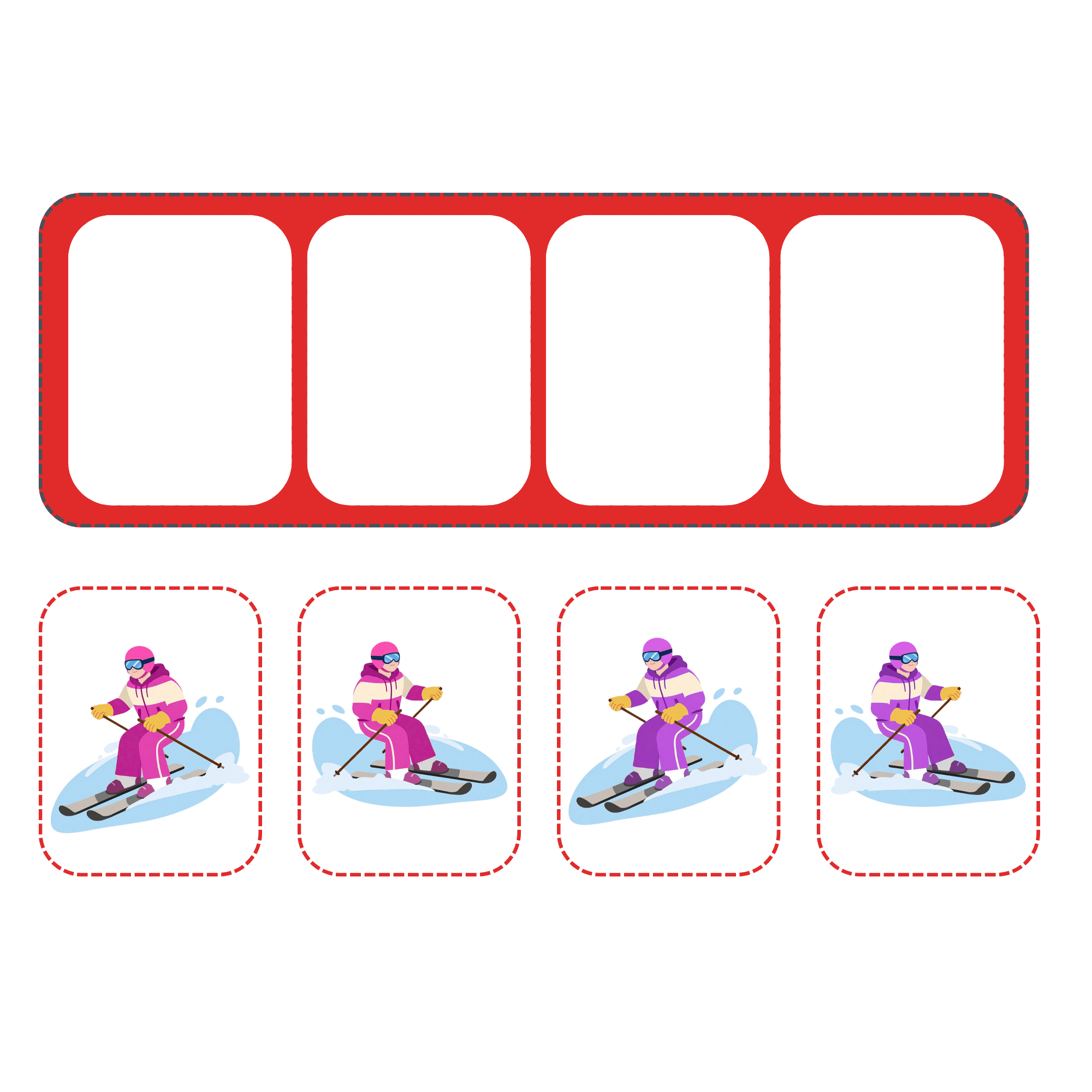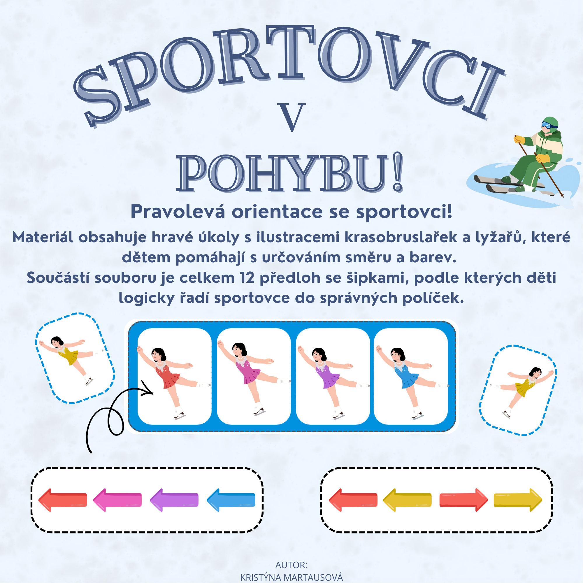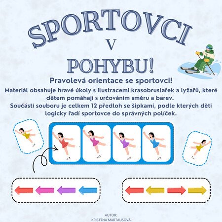 Pomozte dětem ovládnout pravolevou orientaci zábavnou formou! Tento didaktický materiál kombinuje zimní sporty s tréninkem logického myšlení a zrakového vnímání. Úkolem dětí je sledovat barevné šipky a podle nich správně seřadit sportovce na startovní plochu.