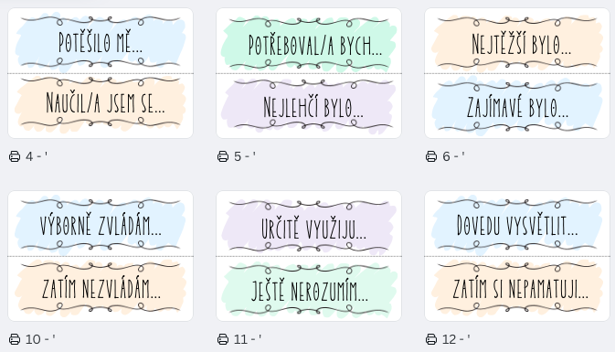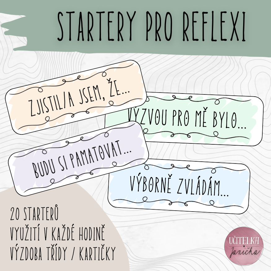 Soubor obsahuje 20 začátků vět („starterů“) pro reflexi. Každý začátek slouží jako pomůcka k vyjádření myšlenky, hodnocení či pocitu žáka.