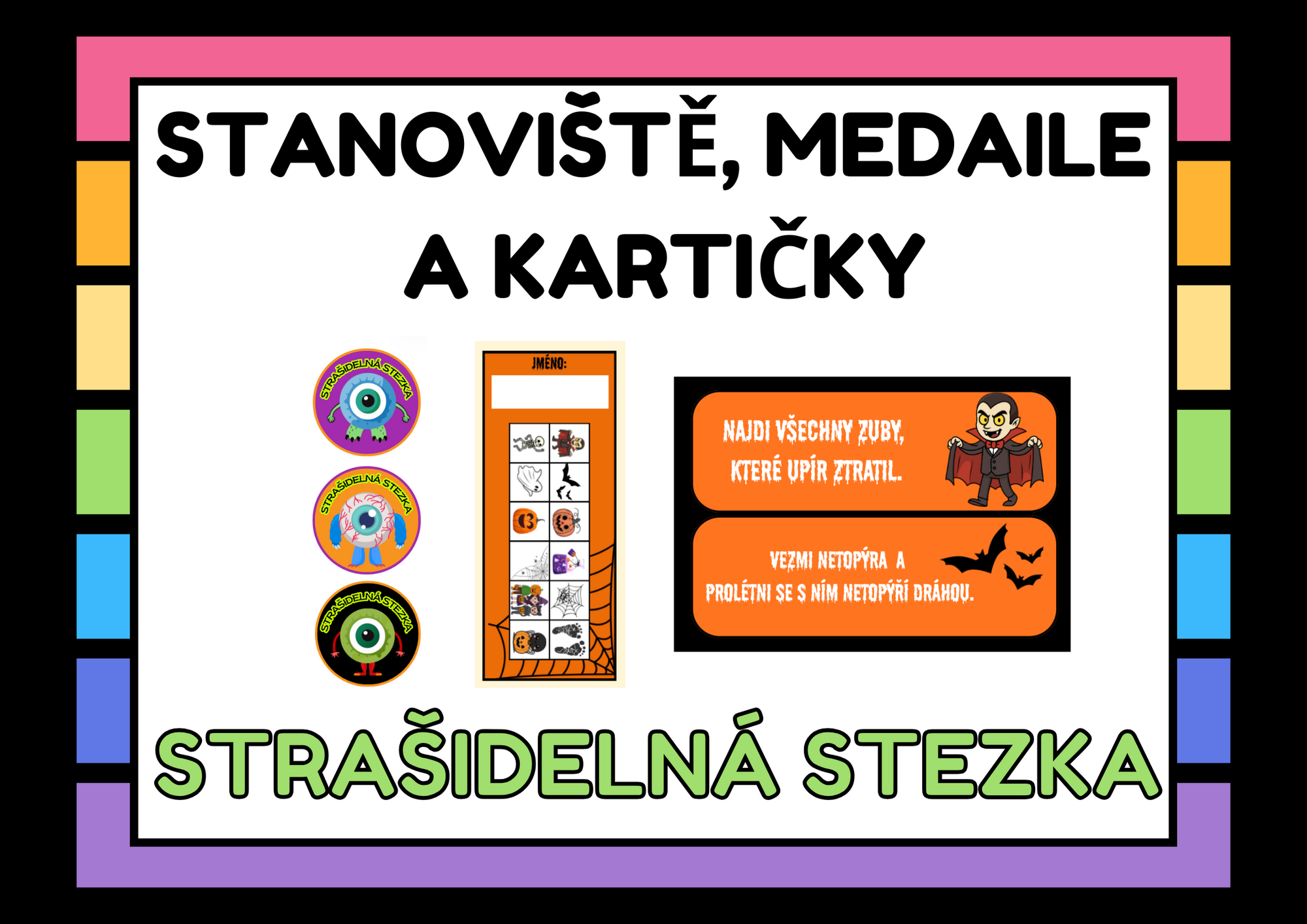 Materiál obsahuje také podrobný popis jednotlivých stanovišť,materiály ke stanovištím, kartičky ke splněným úkolům a medaile, které dostanou za úspěšné splnění.