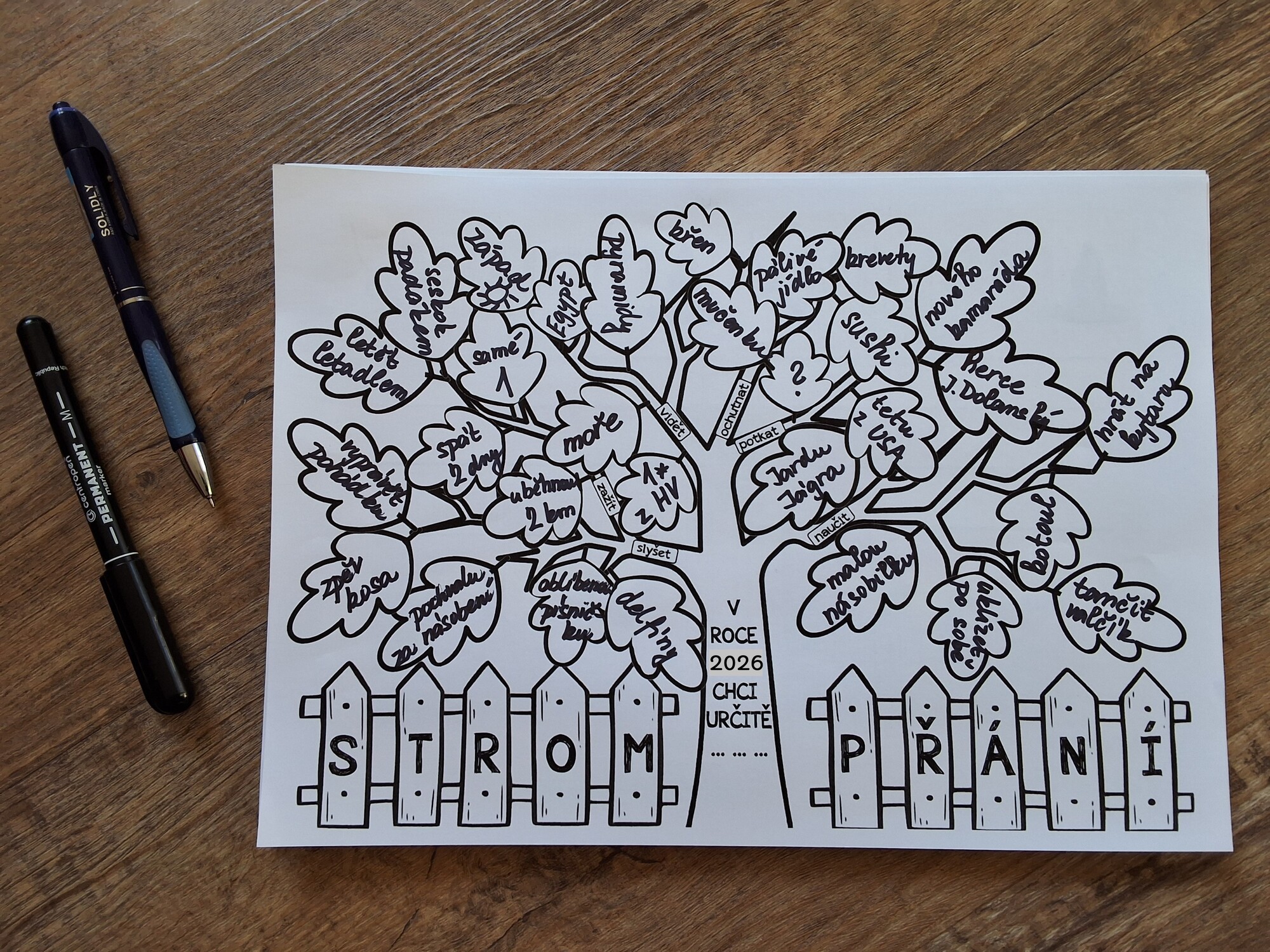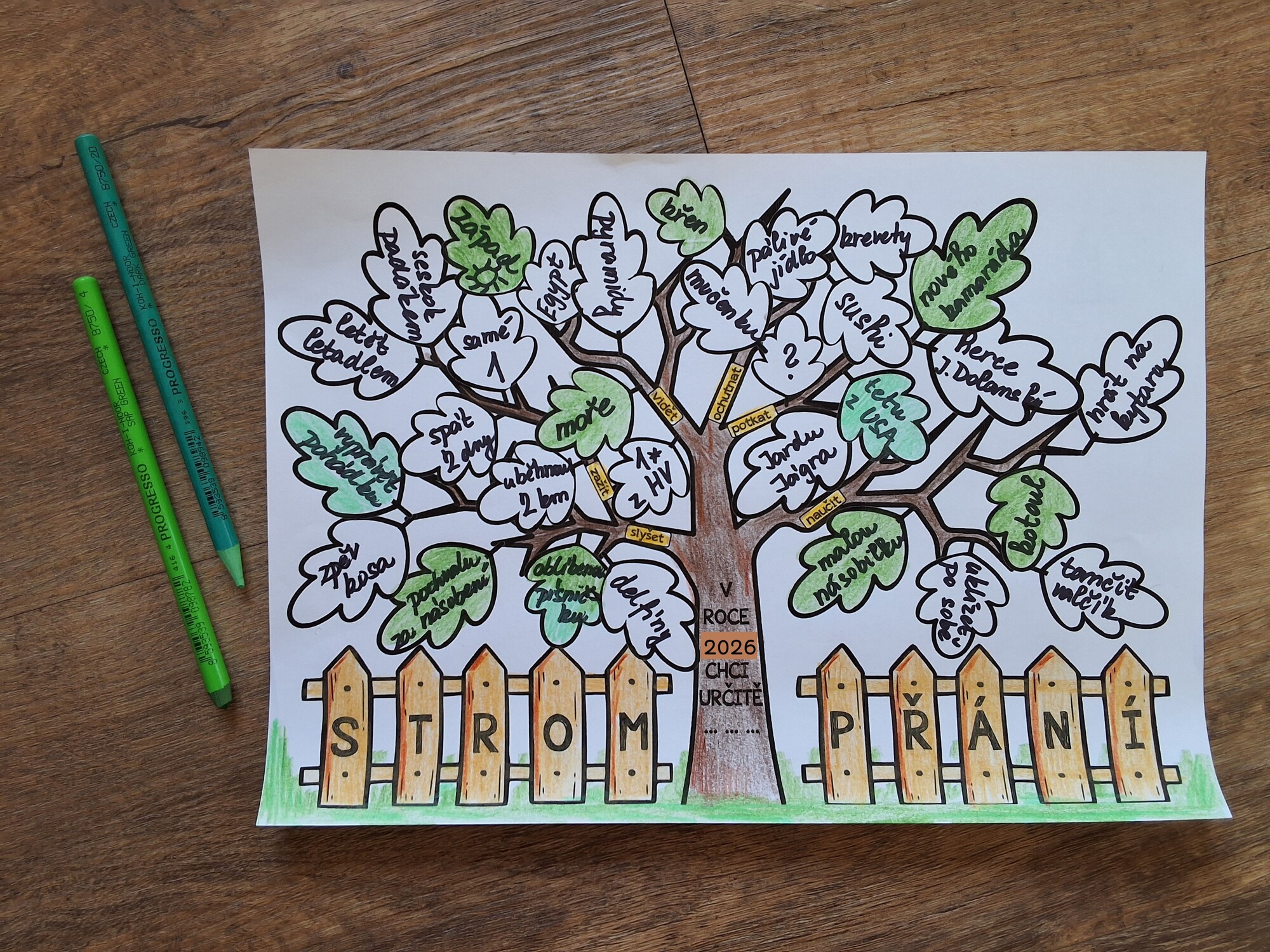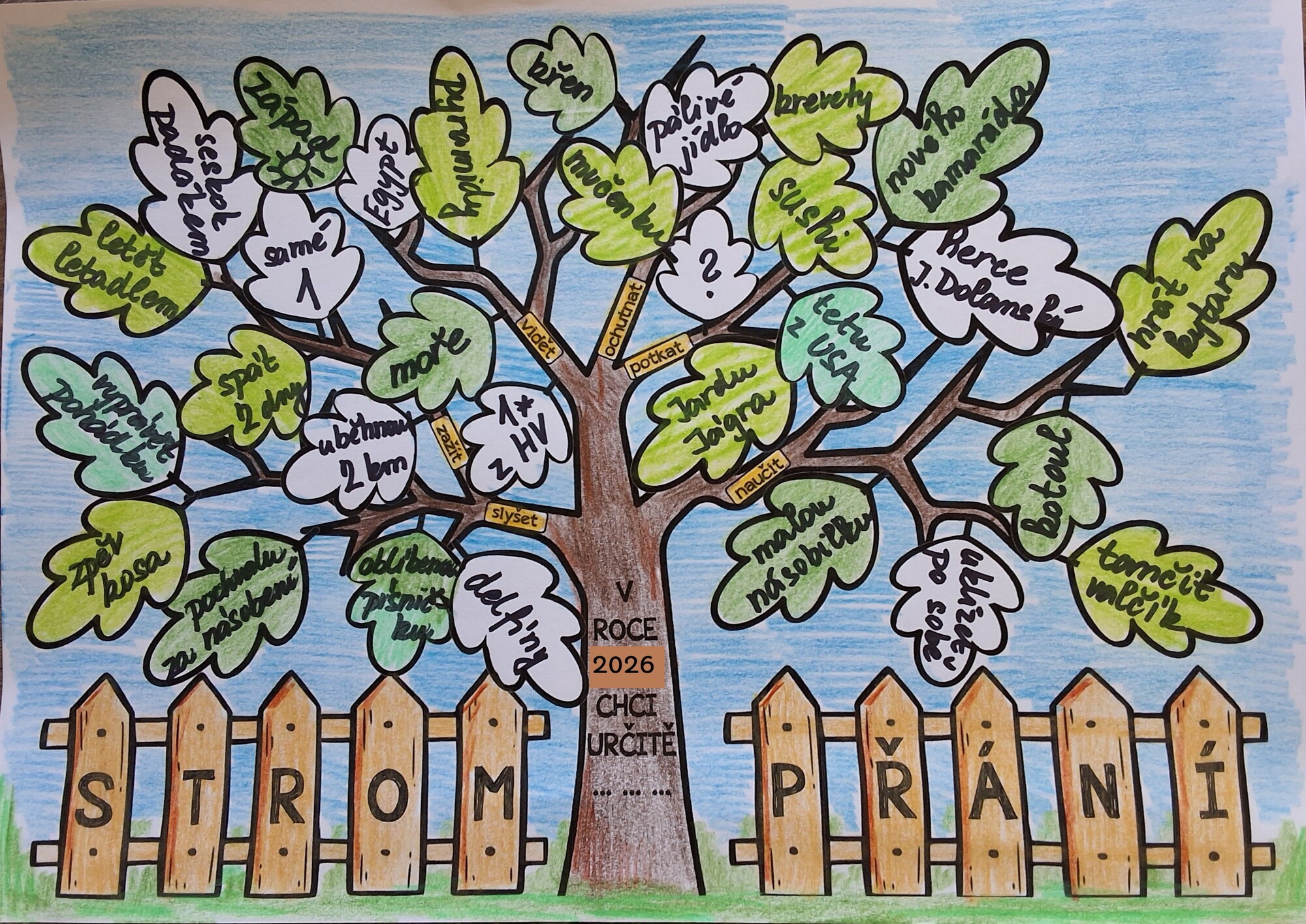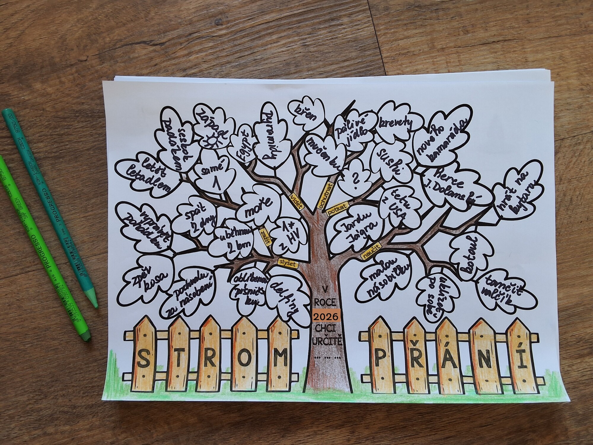 Žáci nejprve samostatně přemýšlejí nad tím, co by chtěli v daném roce zažít, vidět, slyšet, ochutnat, potkat a naučit se. Tyto myšlenky zapisují na listy stromu. Přání mohou být malé, každodenní, ale i velké, troufalé nebo zdánlivě nesplnitelné – materiál s tímto faktem přirozeně pracuje a učí děti přijímat realitu, proces a osobní cestu každého z nich.