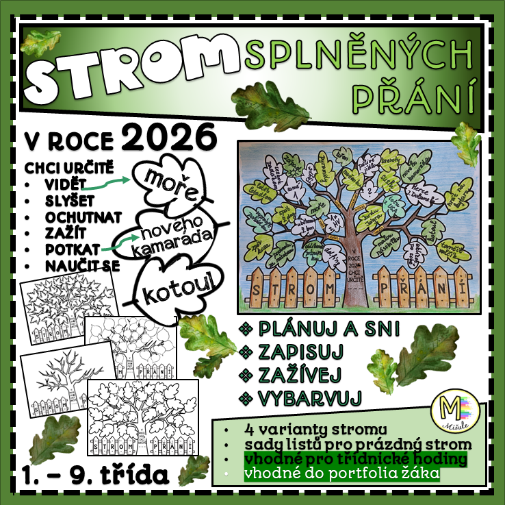 Materiál Strom splněných přání – 2026 je jedinečný výukový nástroj, který vede žáky k vyjadřování vlastních myšlenek, přání, snů a plánů pro celý kalendářní rok. Pomáhá dětem uvědomit si, že mohou být aktivními tvůrci svého života, a podporuje jejich osobnostní růst, vnitřní motivaci a schopnost sebereflexe.