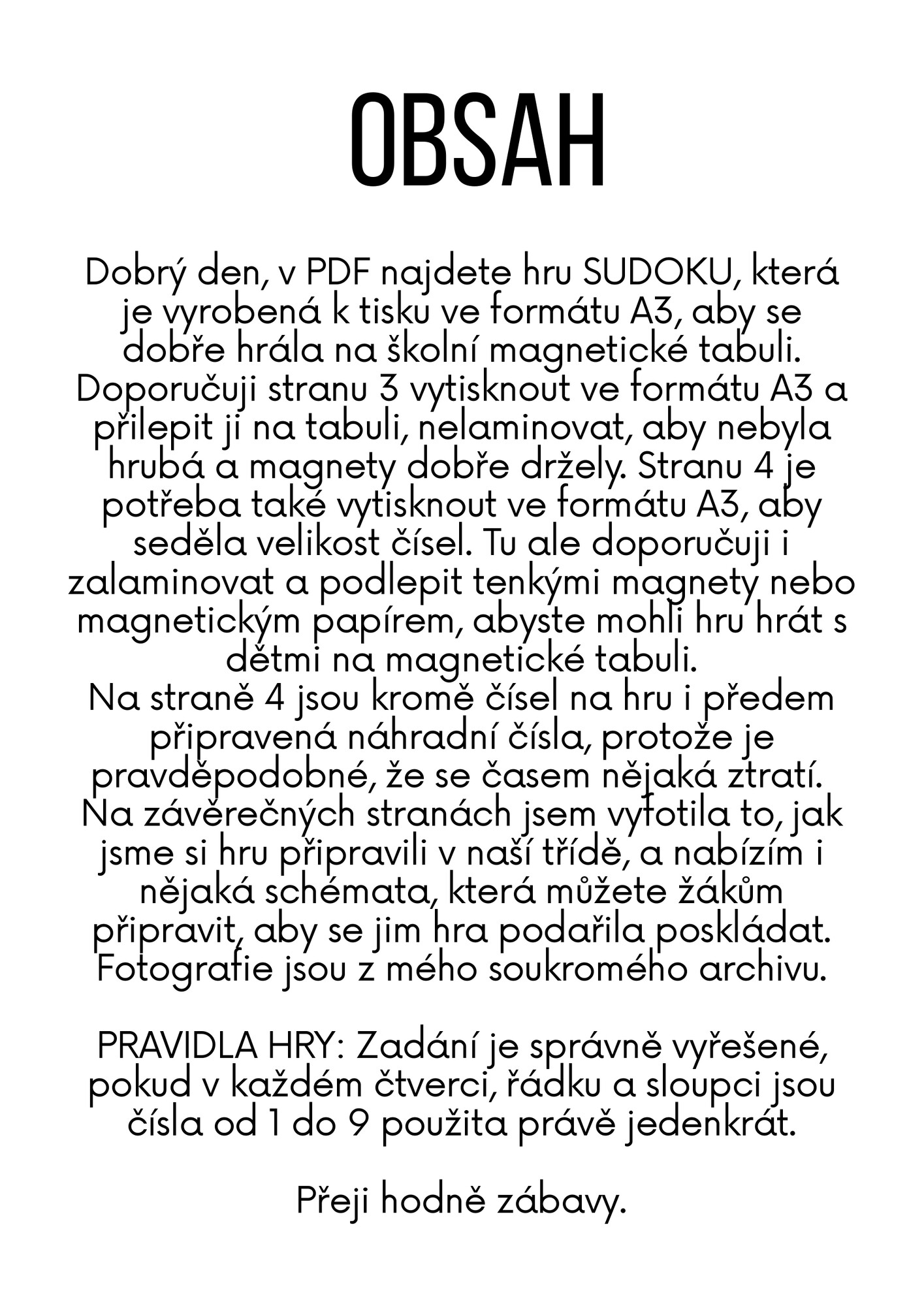 Dobrý den, v PDF najdete hru SUDOKU, která je vyrobená k tisku ve formátu A3, aby se dobře hrála na školní magnetické tabuli.