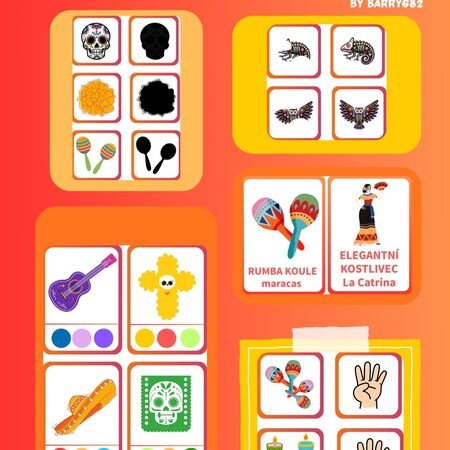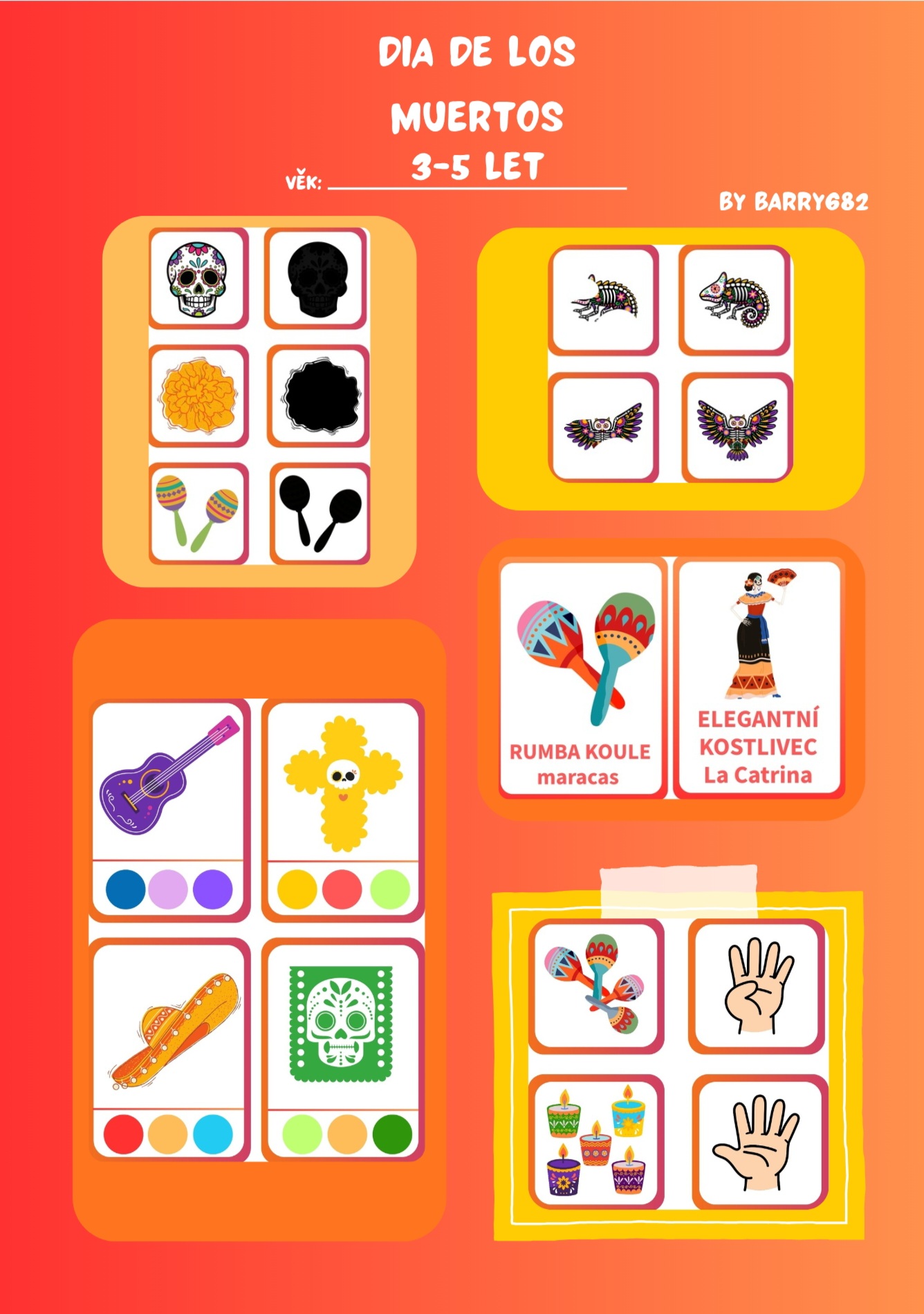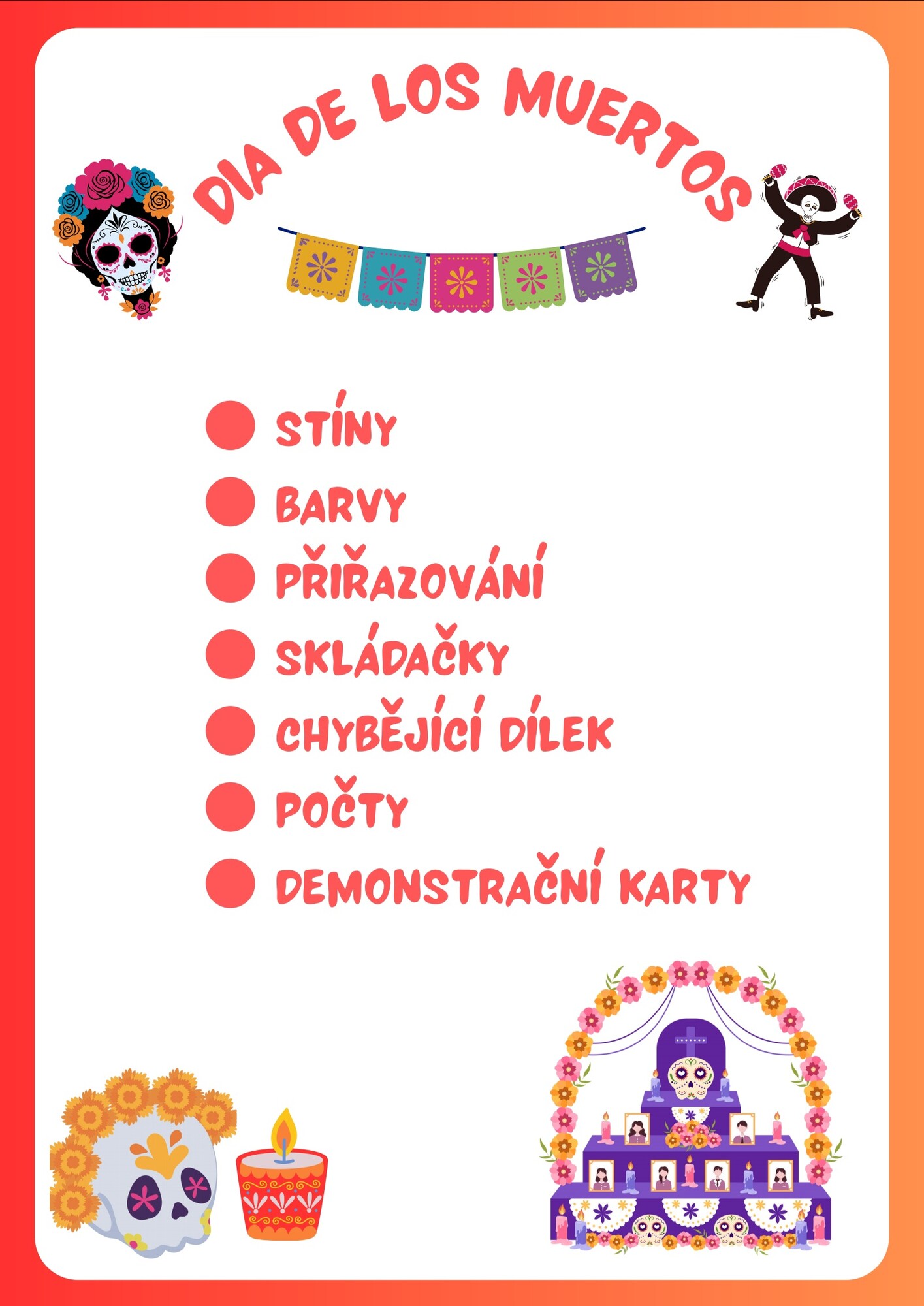 Ranní aktivity na stolečky na téma: Mexický svátek mrtvý - Dia de los muertosRozlišování barev, stínů, velikostíPočtySkládačky Demonstrační karty