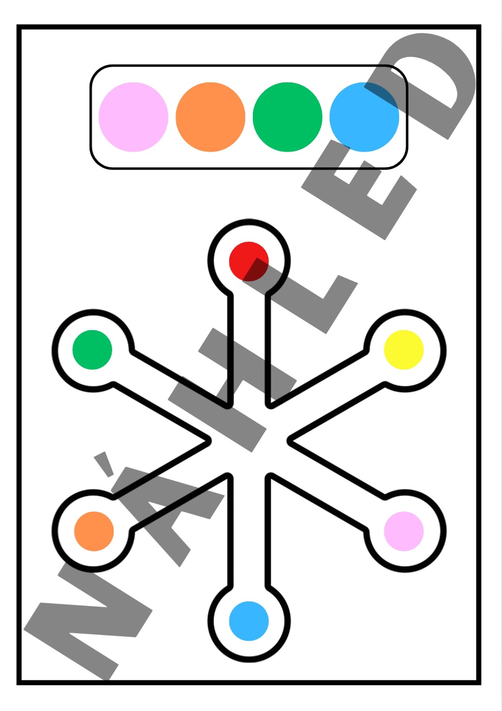 K dispozici je barevná předloha vločky s barevnými puntíky a 6 barevných zadání.