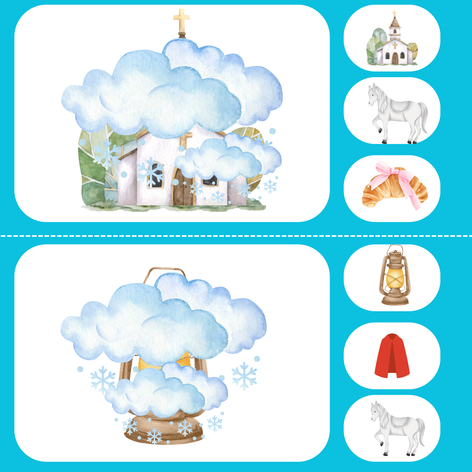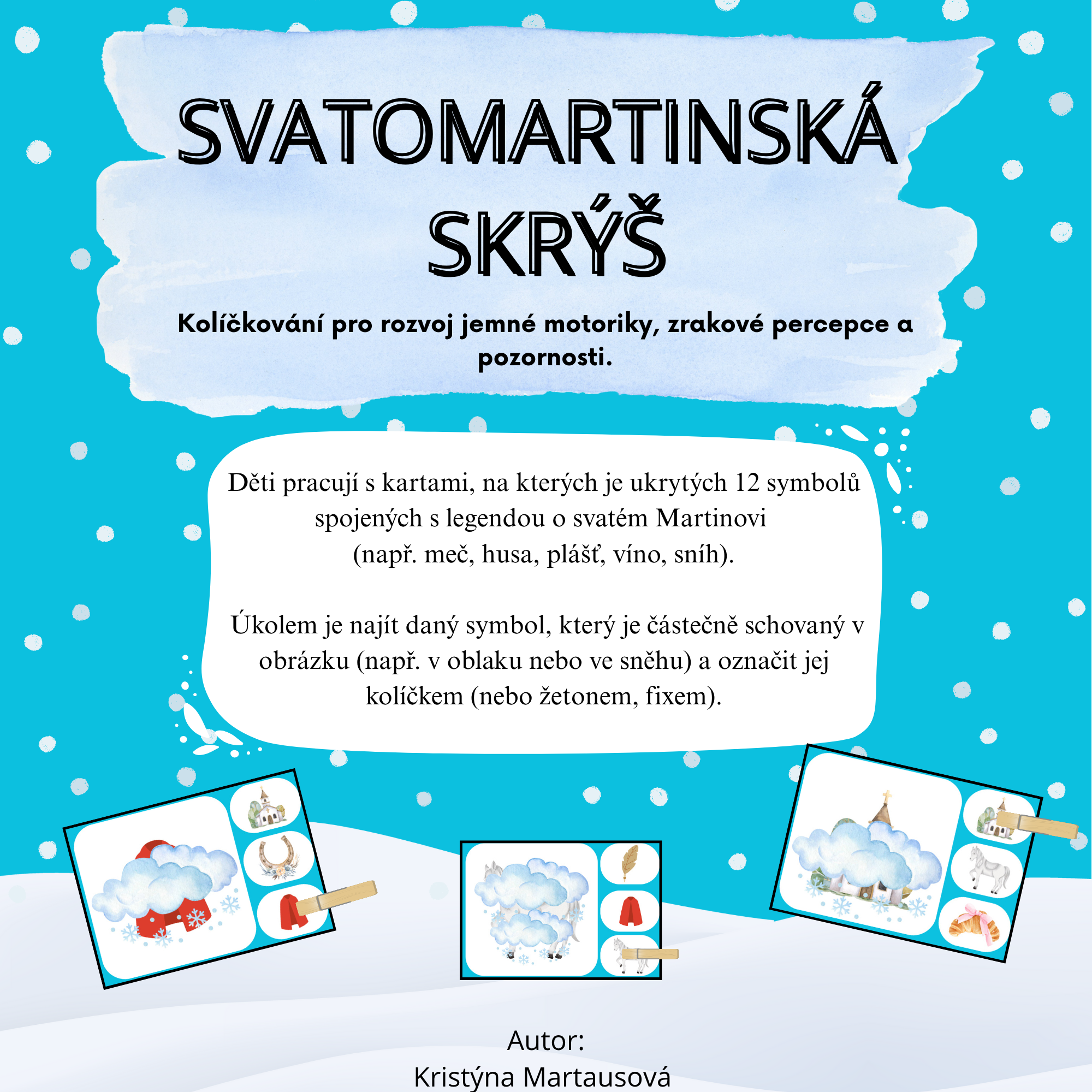 Děti pracují s kartami, na kterých je ukrytých 12 symbolů spojených s legendou o svatém Martinovi (např. meč, husa, plášť, víno, sníh). Úkolem je najít daný symbol, který je částečně schovaný v obrázku (např. v oblaku nebo ve sněhu) a označit jej kolíčkem (nebo žetonem, fixem).