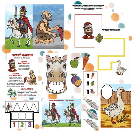 Součástí materiálu je příběh o svatém Martinovi v jednoduché podobě pro děti, plakát s přehlednými informacemi vhodný i na nástěnku, a především bohatá sada aktivit pro rozvoj jemné motoriky, grafomotoriky, zrakového vnímání, prostorové orientace i logického myšlení.