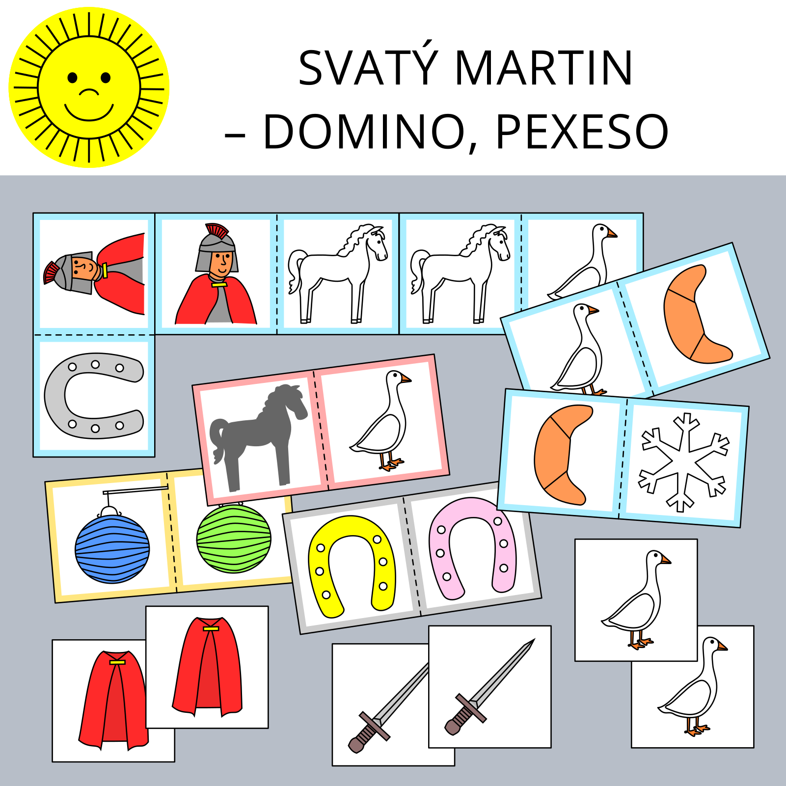 Materiál obsahuje čtyři strany s kartičkami domina (1 strana = 1 sada kartiček domina = 10 kartiček) a čtyři strany s kartičkami pexesa (40 dvojic). Tématem je svátek svatého Martina.