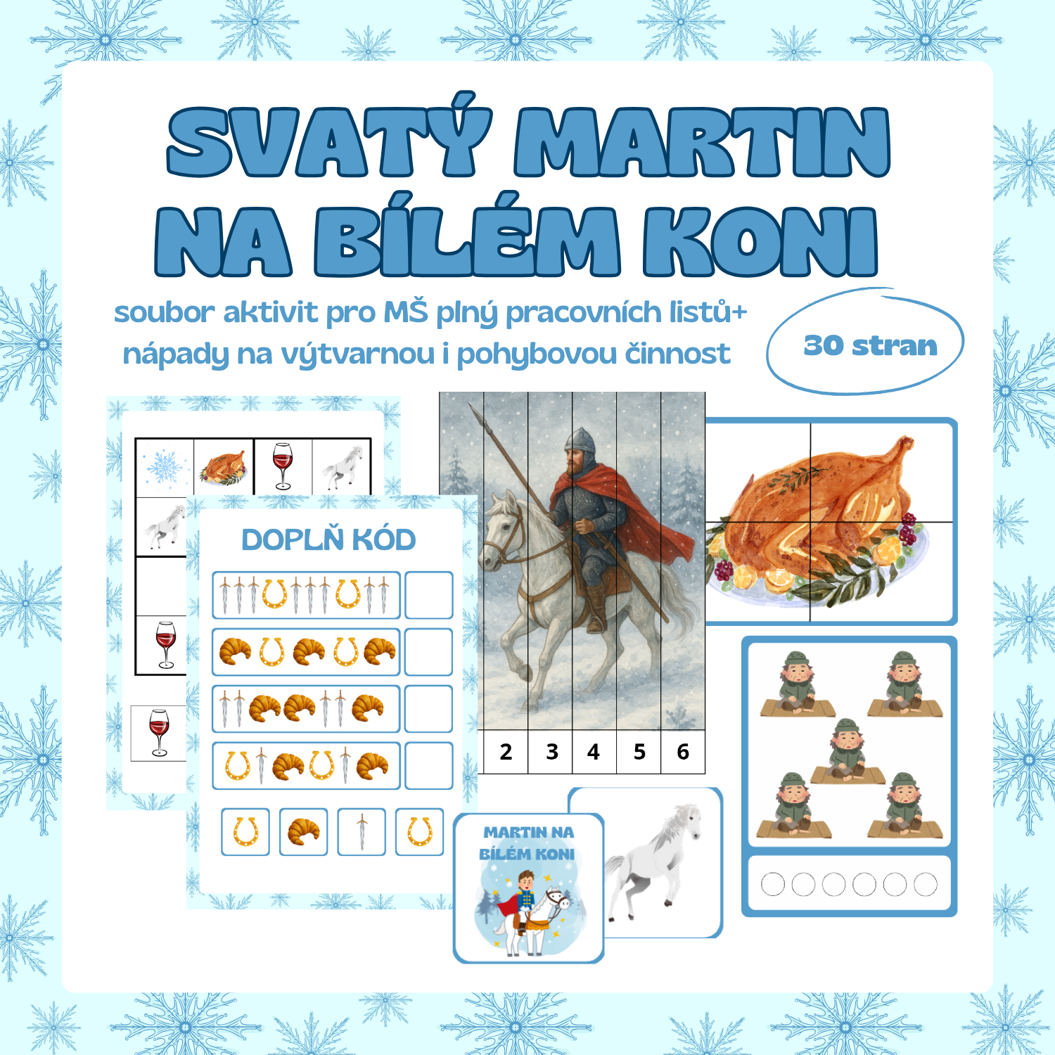 Materiál je zaměřen na téma Svatý Martin na bílém koni. Toto téma je dětem přiblíženo zejména pomocí pracovních listů a aktivit. Též v materiálu najdete nápady na výtvarnou či pohybovou činnost, podtémata do ranních kruhů a pohádku.