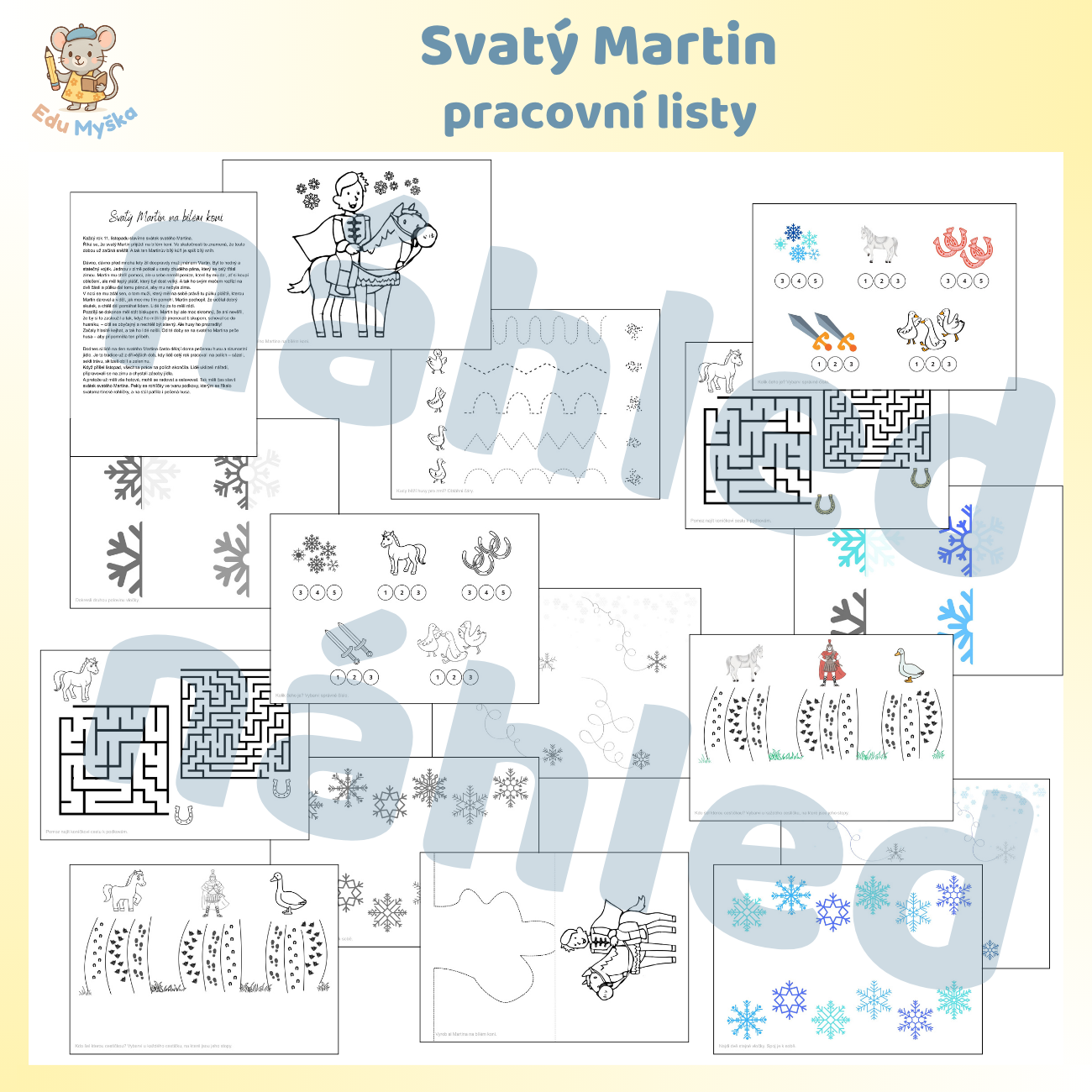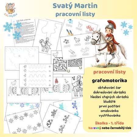 Materiál obsahuje úvodní příběh o svatém Martinovi, pracovní listy, u kterých děti mohou procvičovat a upevňovat grafomotorické dovednosti, rozvíjí také logické myšlení. Dále obsahuje omalovánku a vystřihovánku sv. Martina.