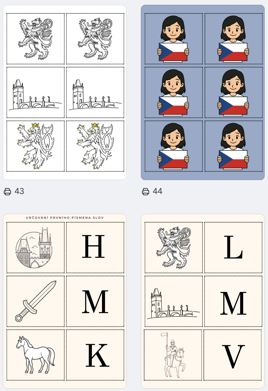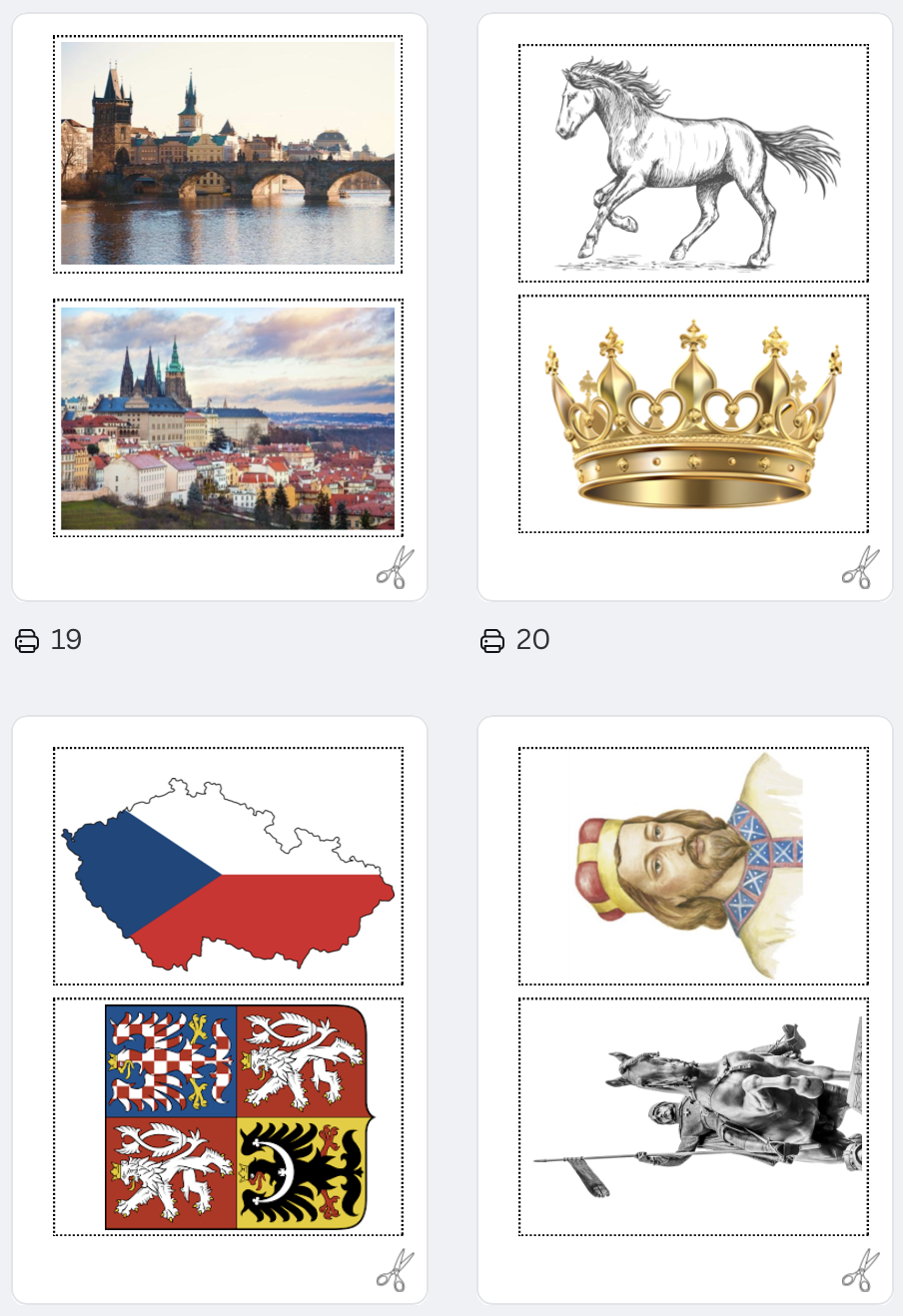 - ✦ Didaktické karty k poznávání českých symbolů (vlajka, koruna, lev, hrad, kůň)