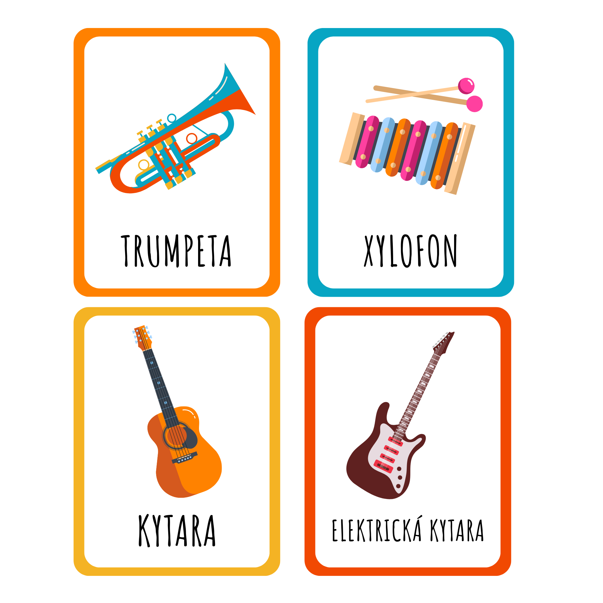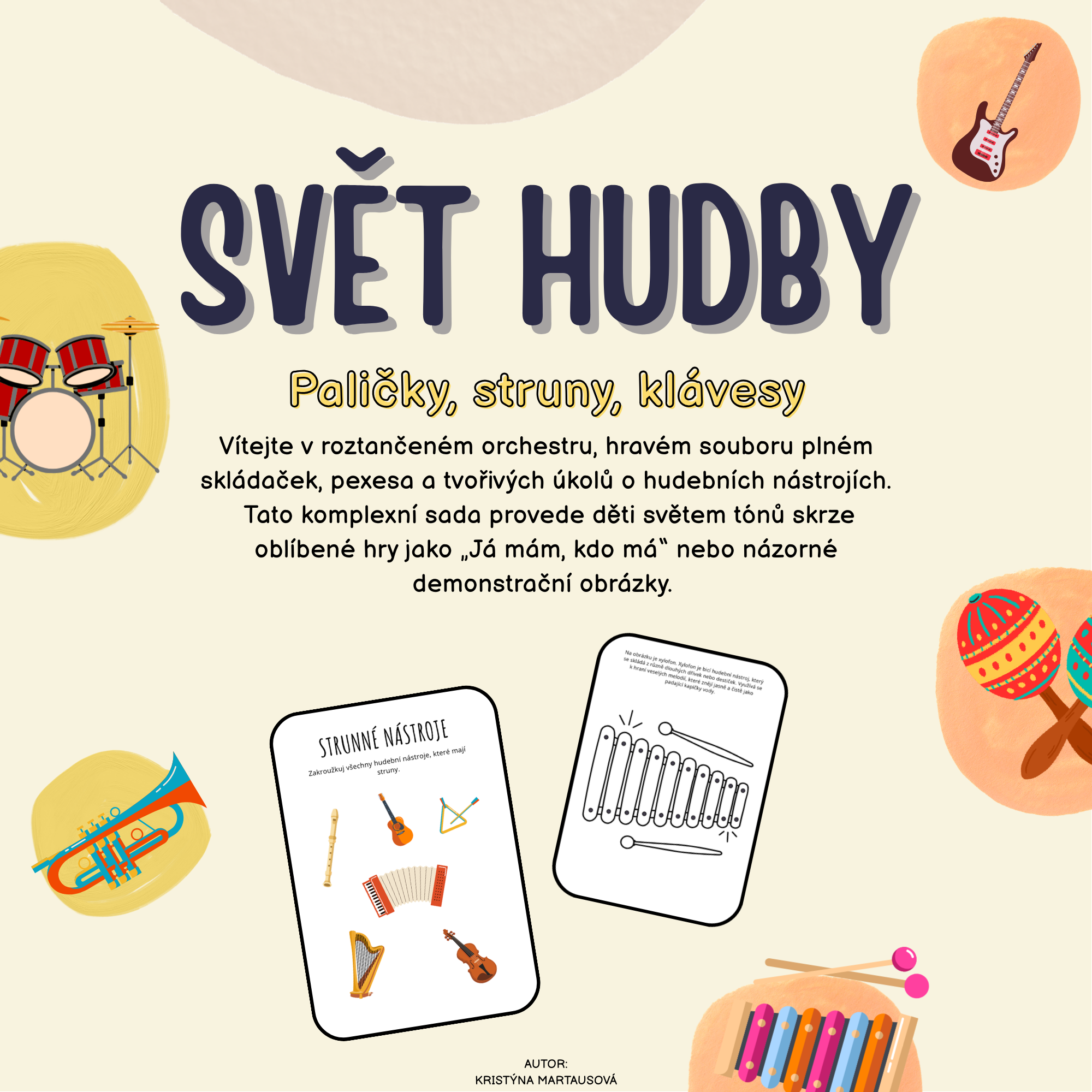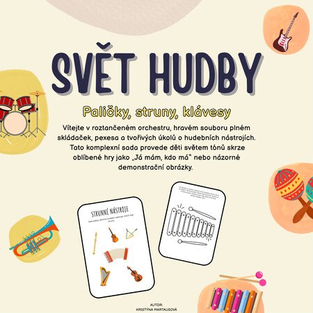 - Demonstrační obrázky: Jasné a barevné ilustrace hudebních nástrojů pro snadné poznávání.