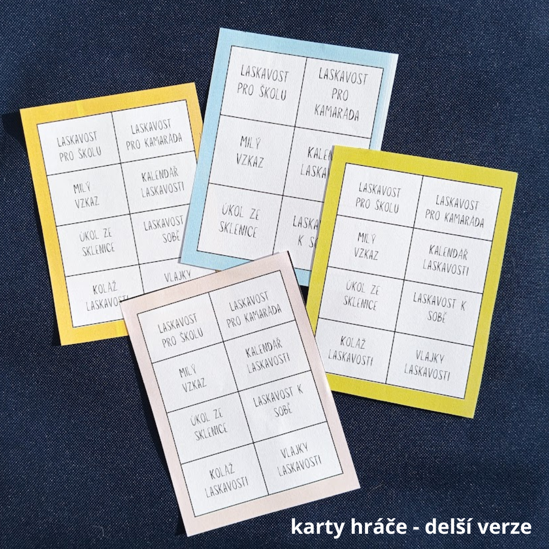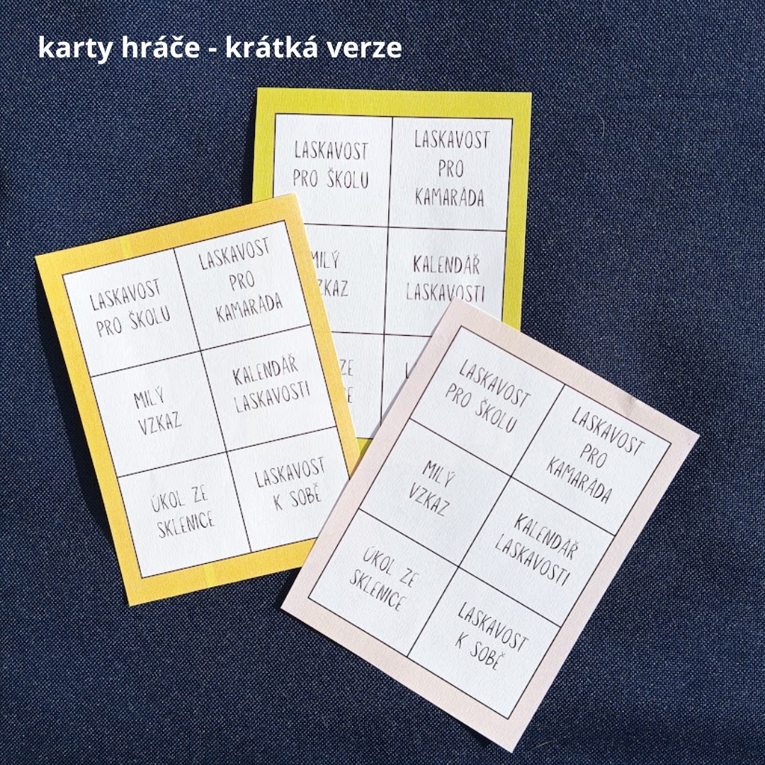 - Pro mladší děti využijte kratší verzi karty hráče (6 úkolů), pro starší delší (8 úkolů).