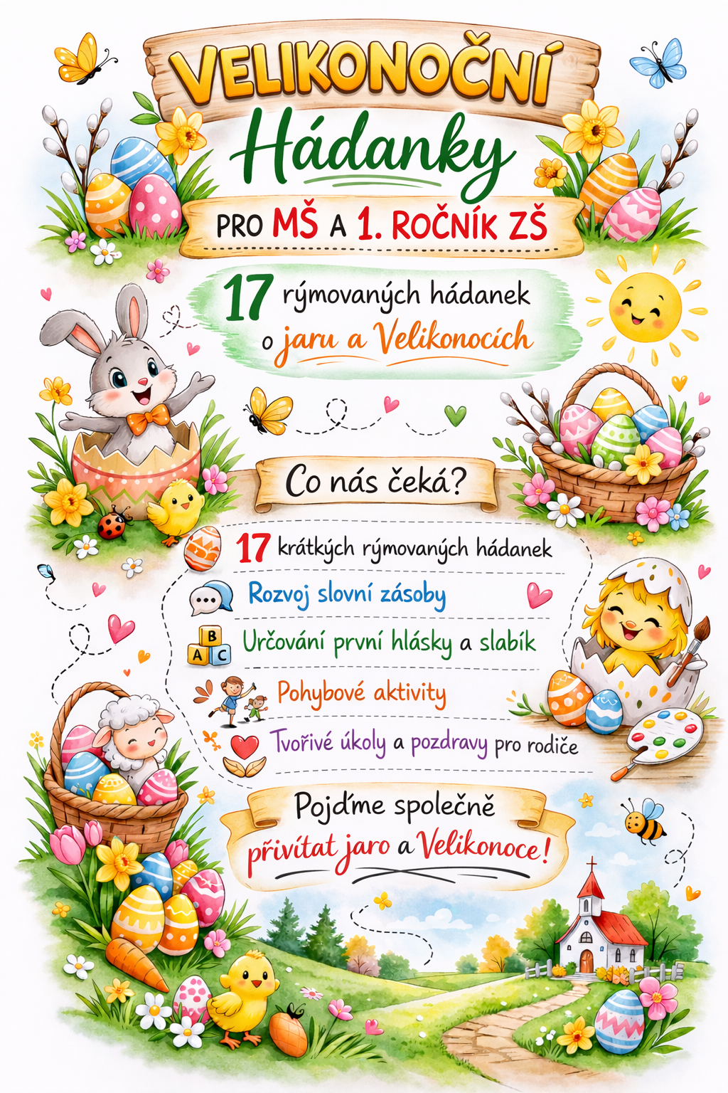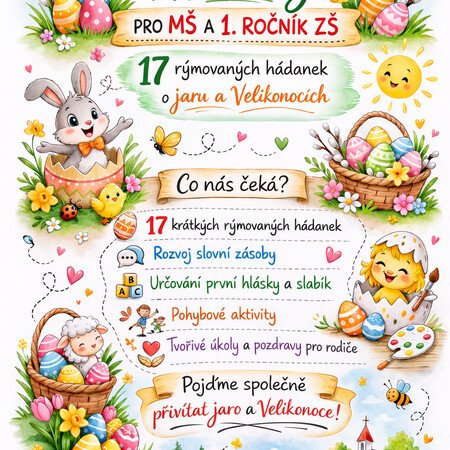 Edukační PDF materiál obsahuje 17 rýmovaných velikonočních hádanek zpracovaných ve formě tematických kartiček. Soubor je vhodný pro děti v mateřské škole a žáky 1. ročníku ZŠ.