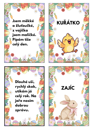 - 17 rýmovaných velikonočních hádanek (vajíčkové kartičky)