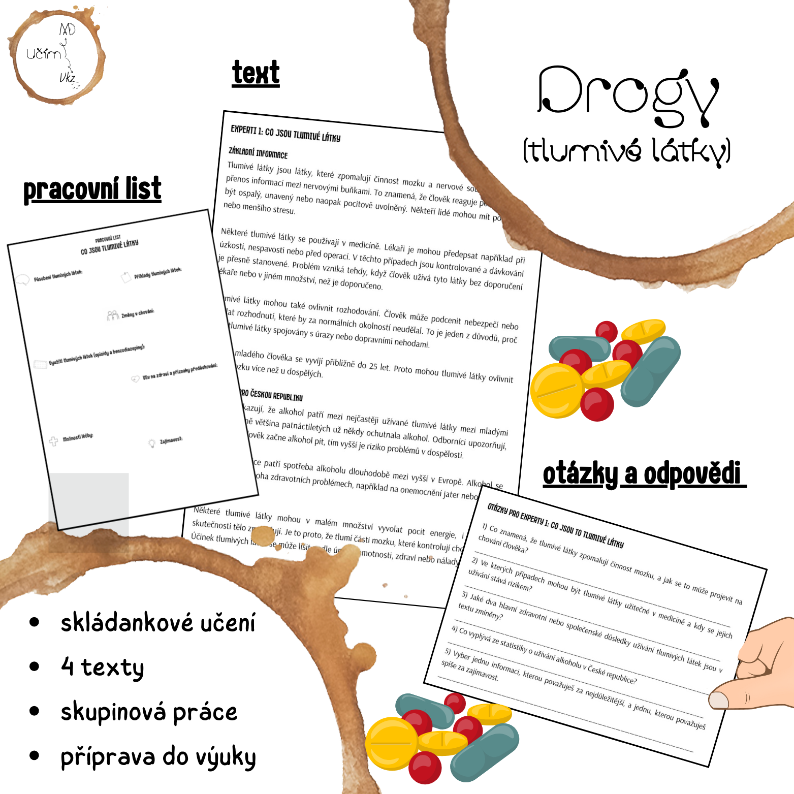 Příprava na vyučovací hodiny na téma Tlumivé drogy. Materiál obsahuje přípravu na vyučovací hodinu formou kooperativní metody - skládankové učení, spočívající ve vzájemném učení žáků.