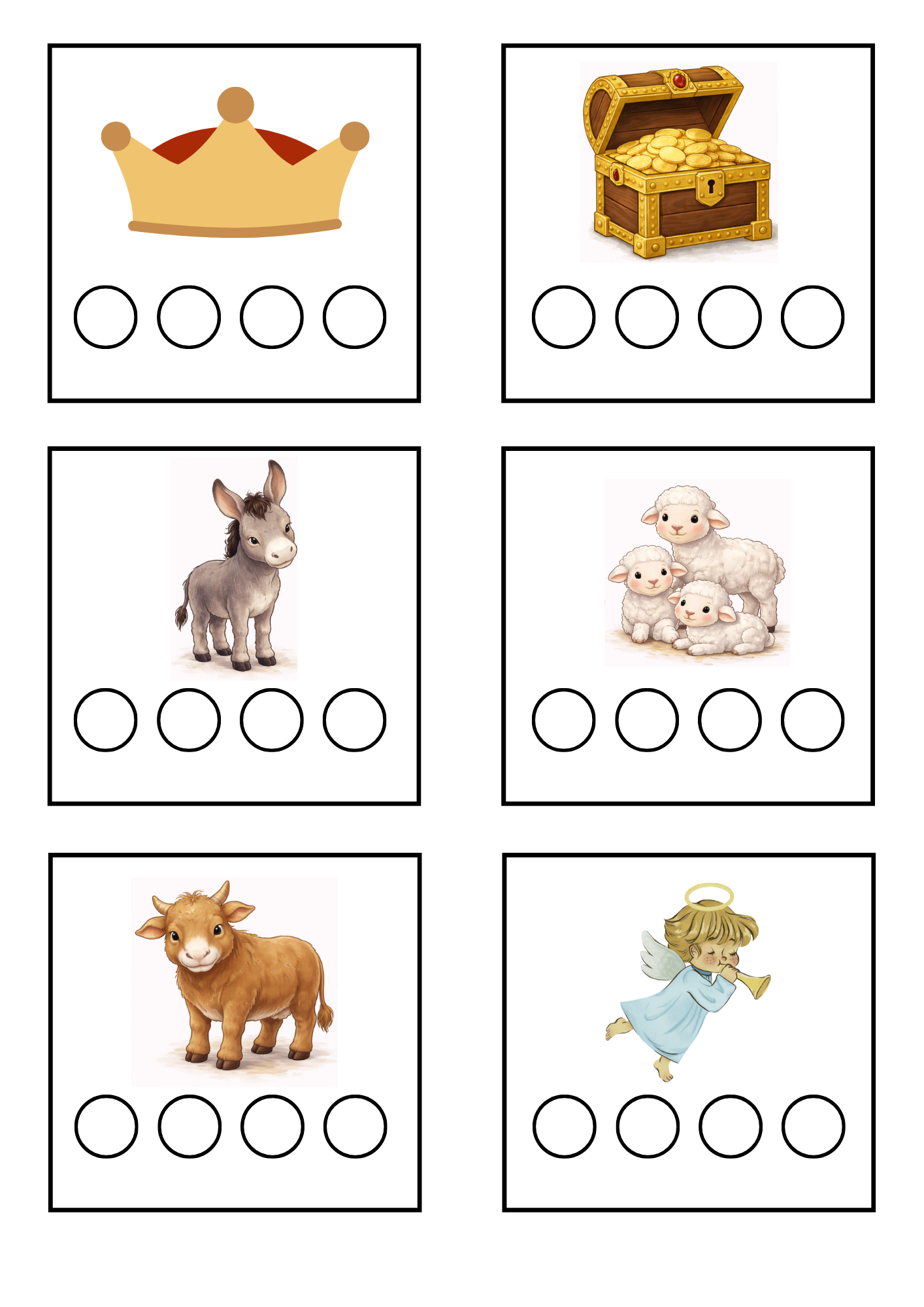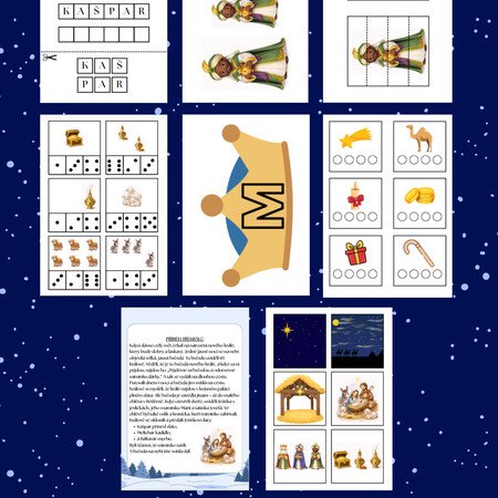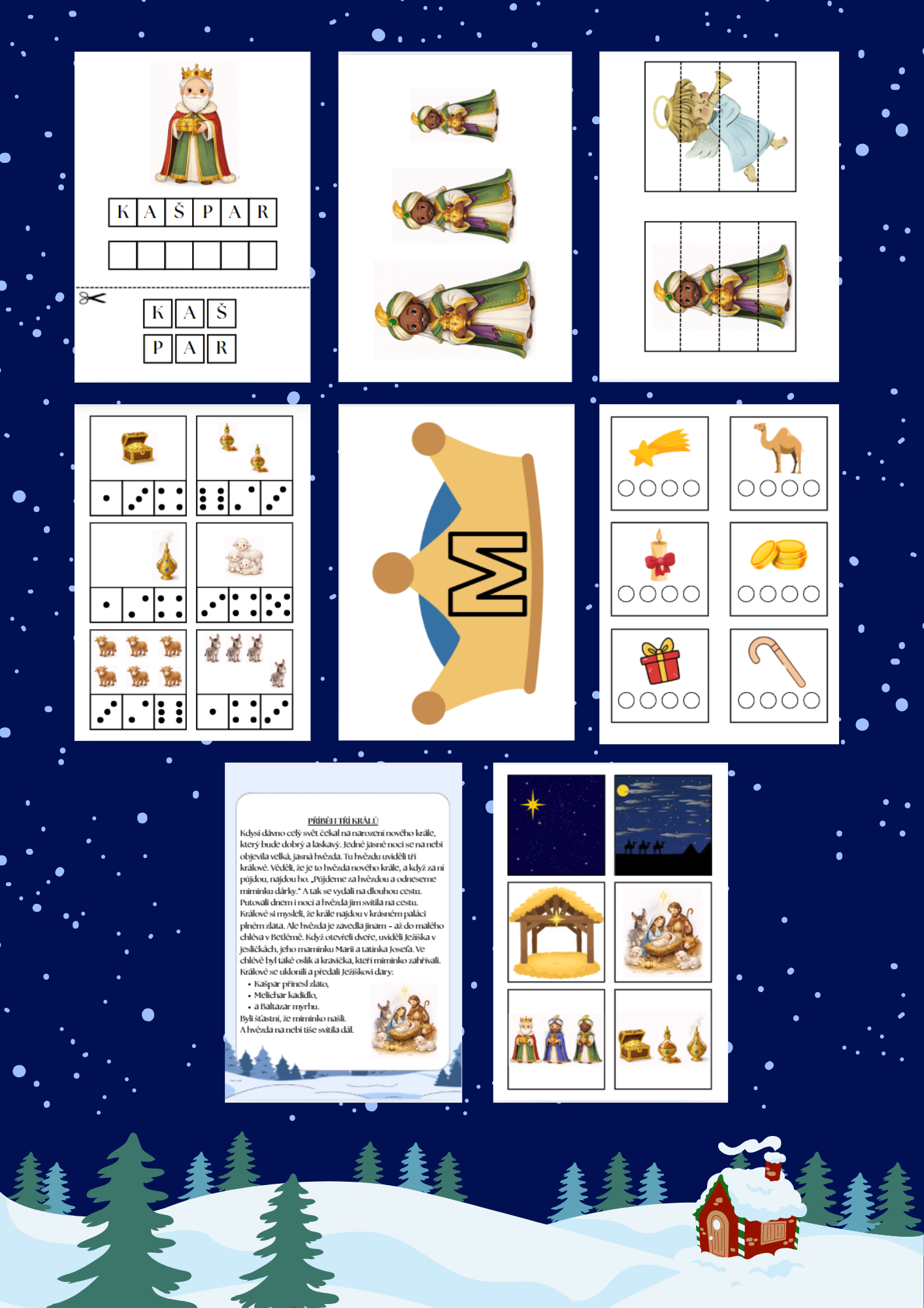 - Obrázky tří králů + dary, Ježíšek, Marie, Josef, zvířátka - osel, vůl a ovečky