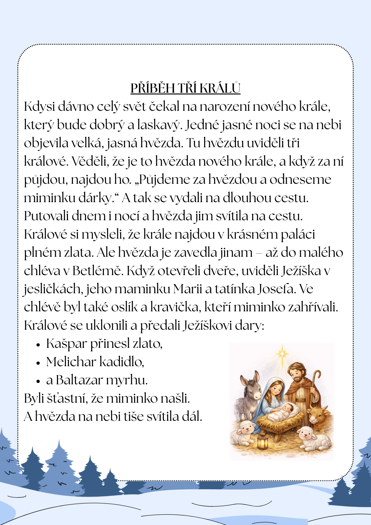 - Příběh tři králové + kartičky, jak šel příběh postupně