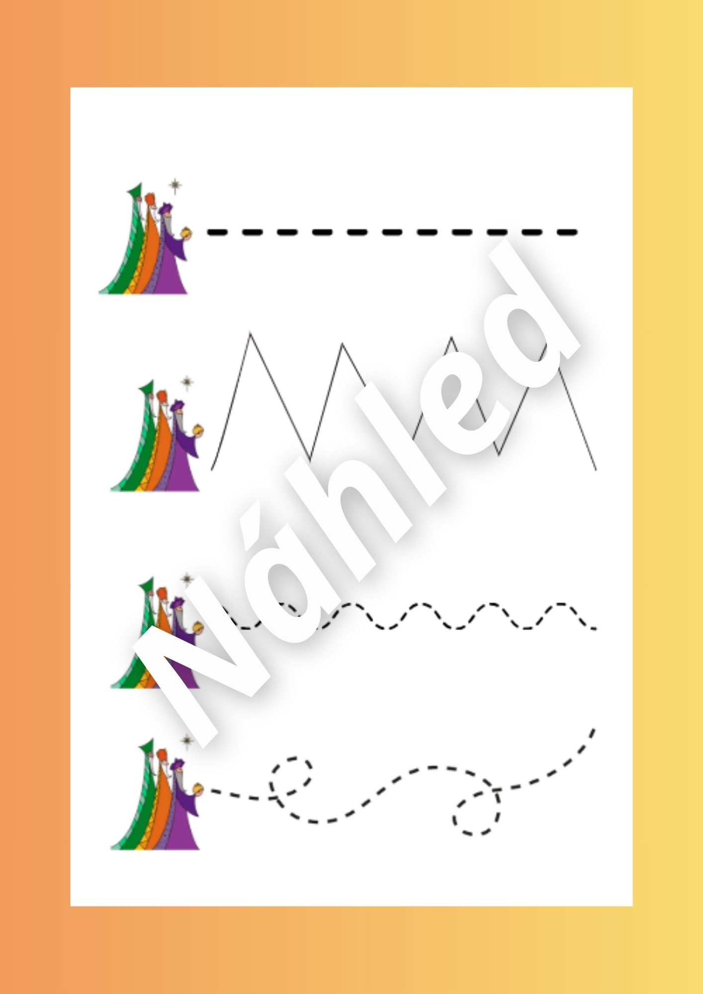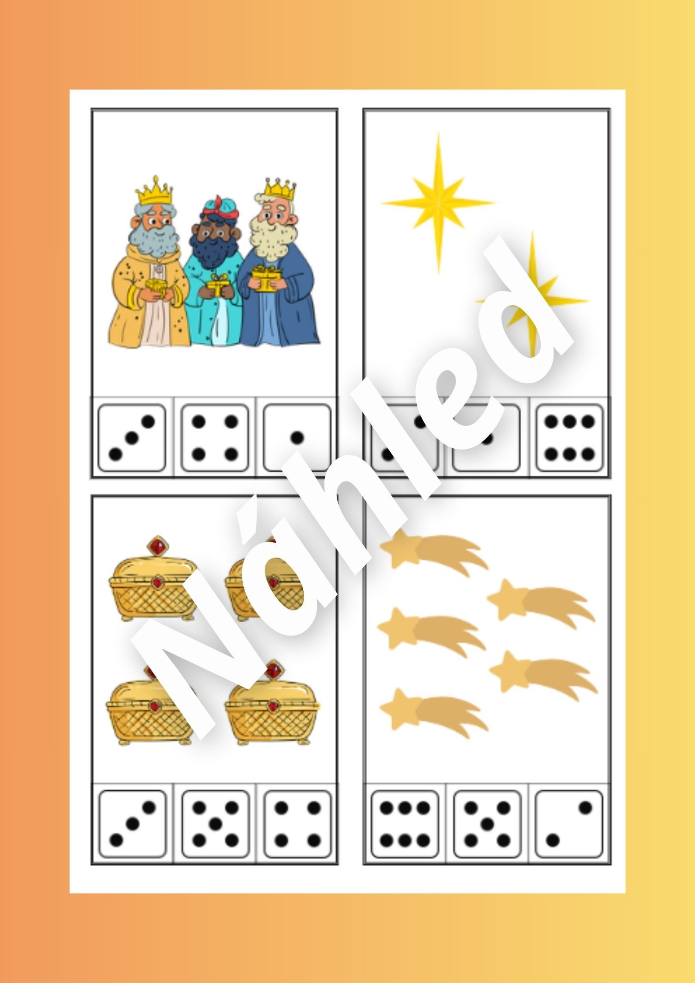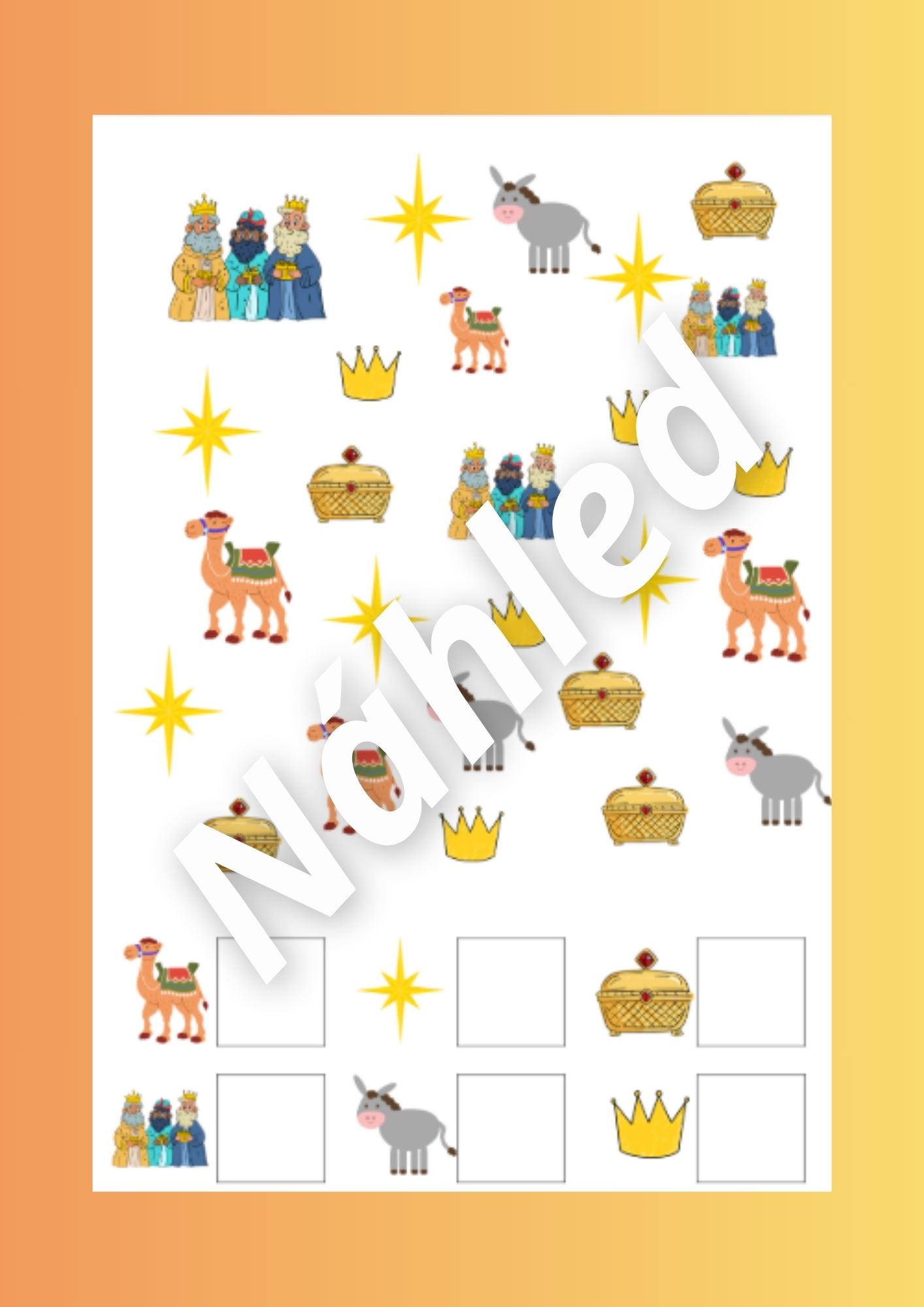 Soubor obsahuje:Kolíčkování - počtyPuzzleKoruny na provlékáníPracovní list procvičení počtůBludiště 3xGrafomotorikaCesta tří králů - rozvoj prostorové orientace