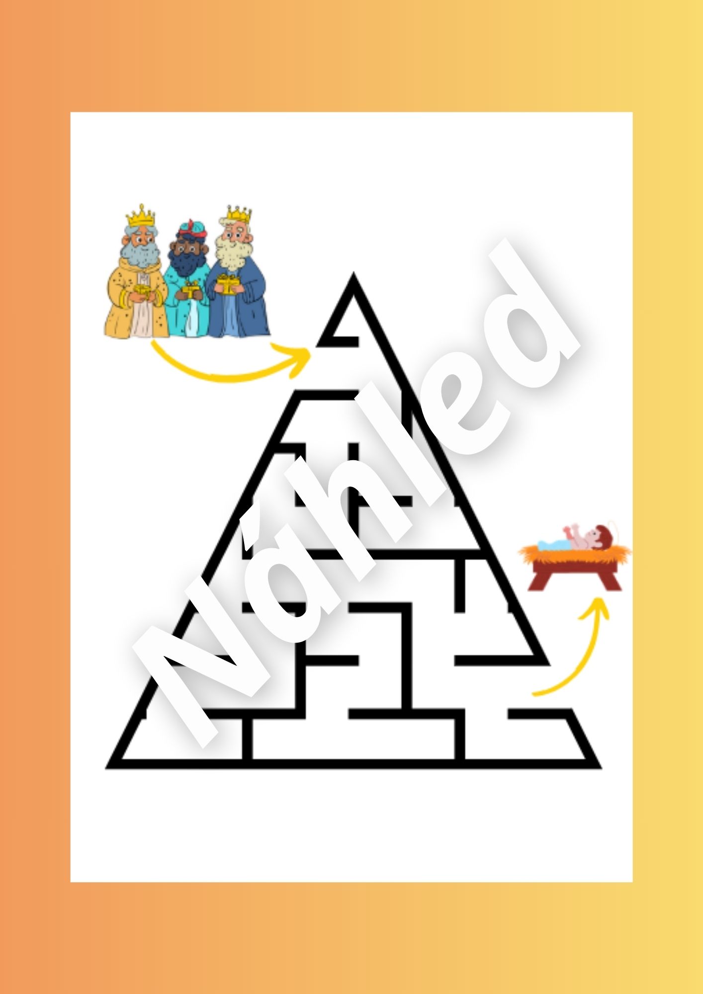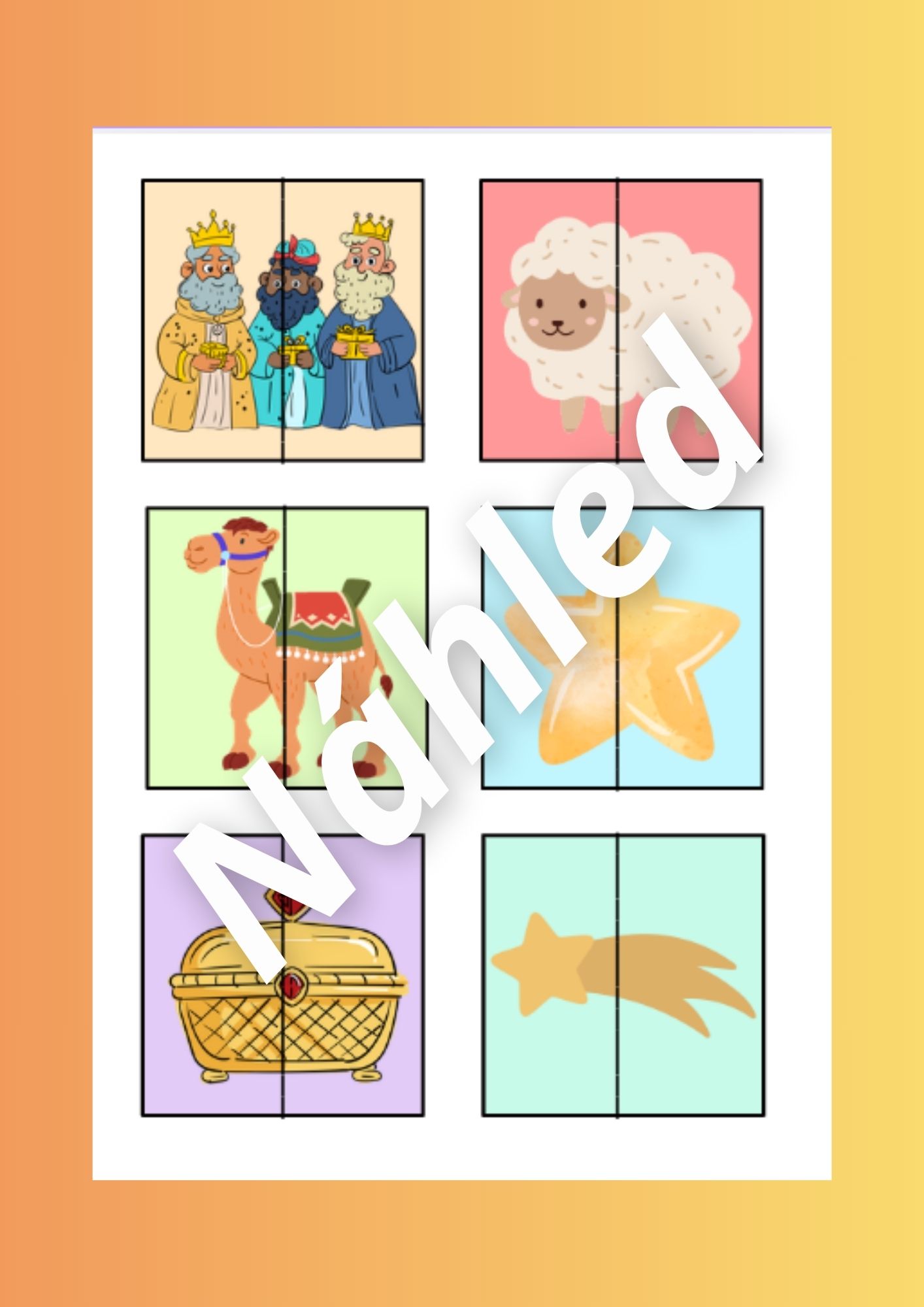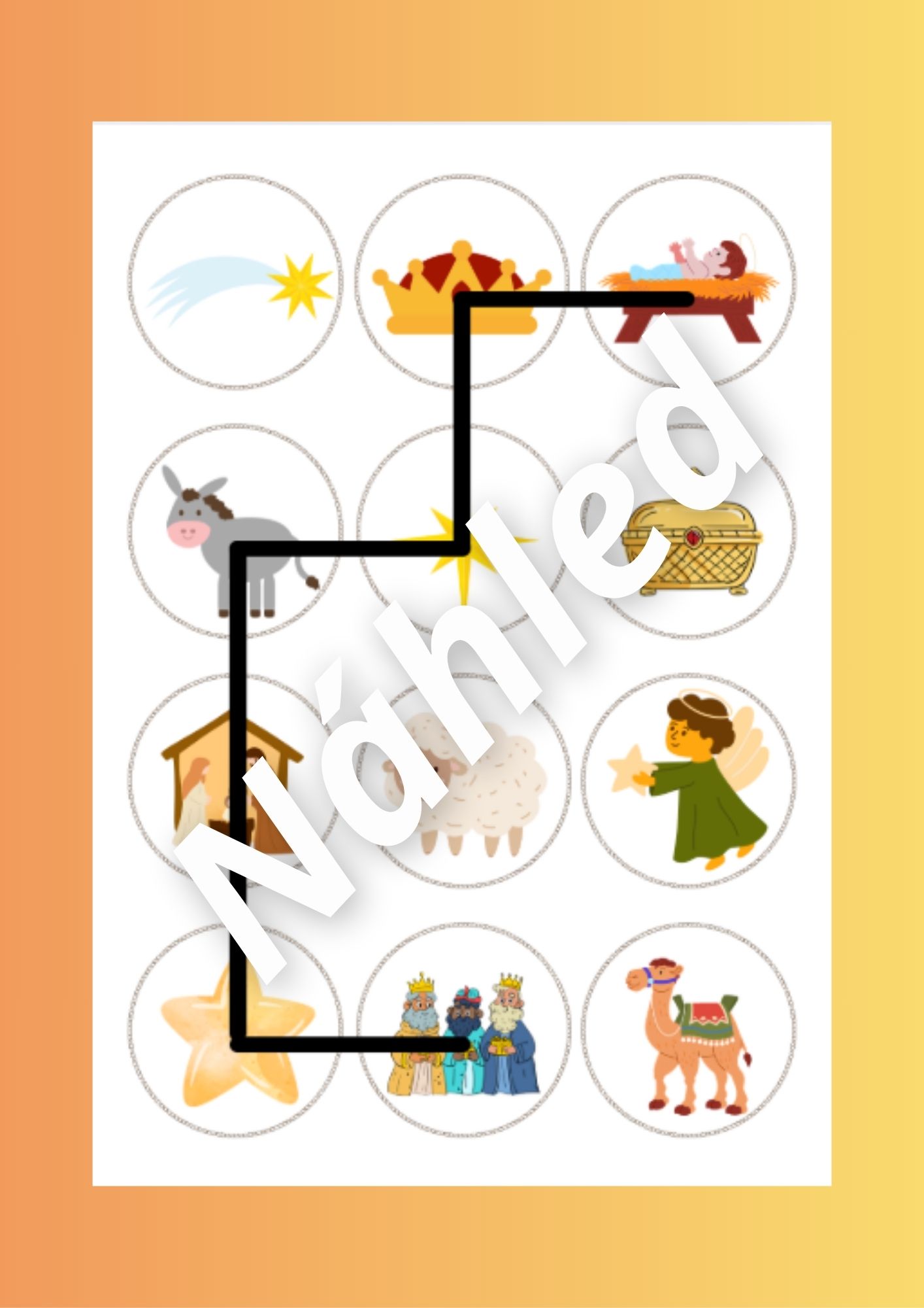 Soubor obsahuje:Kolíčkování - počtyPuzzleKoruny na provlékáníPracovní list procvičení počtůBludiště 3xGrafomotorikaCesta tří králů - rozvoj prostorové orientace