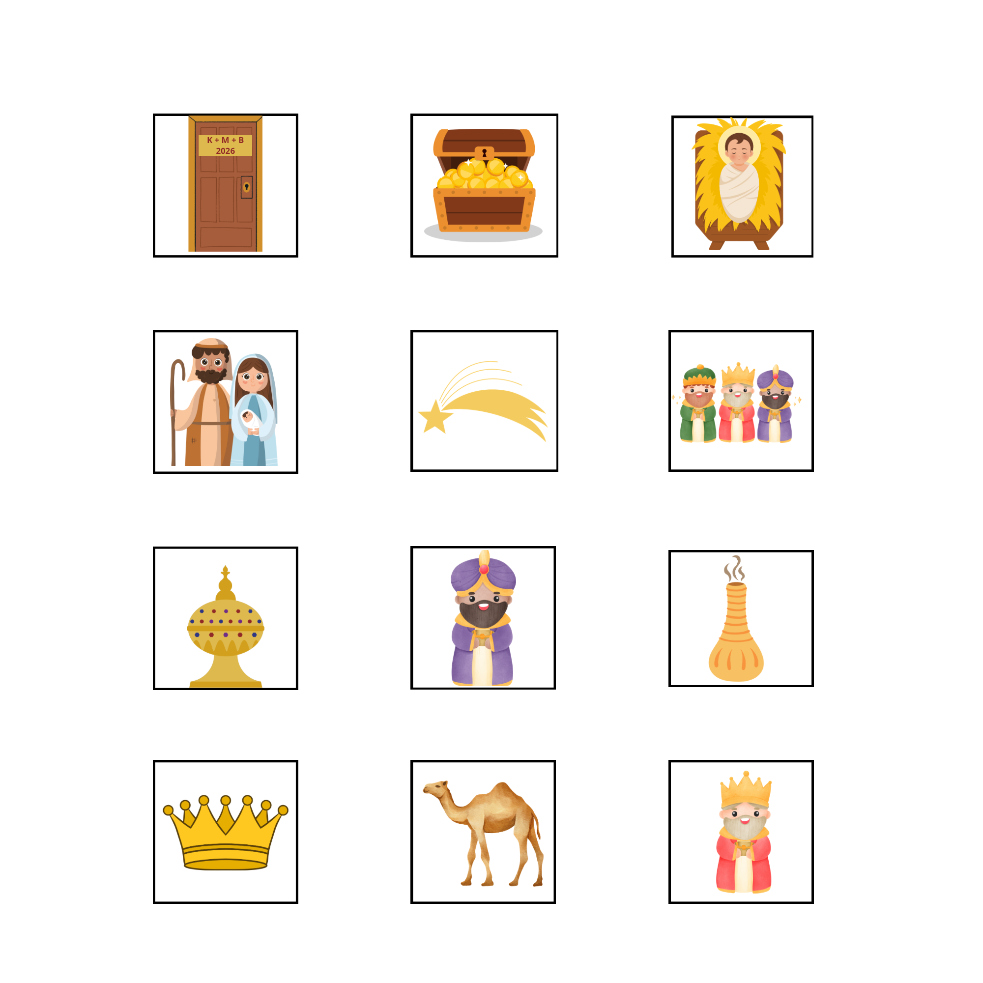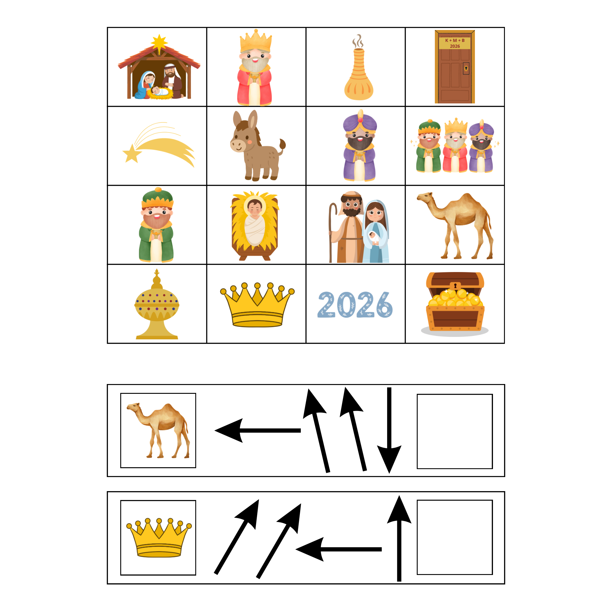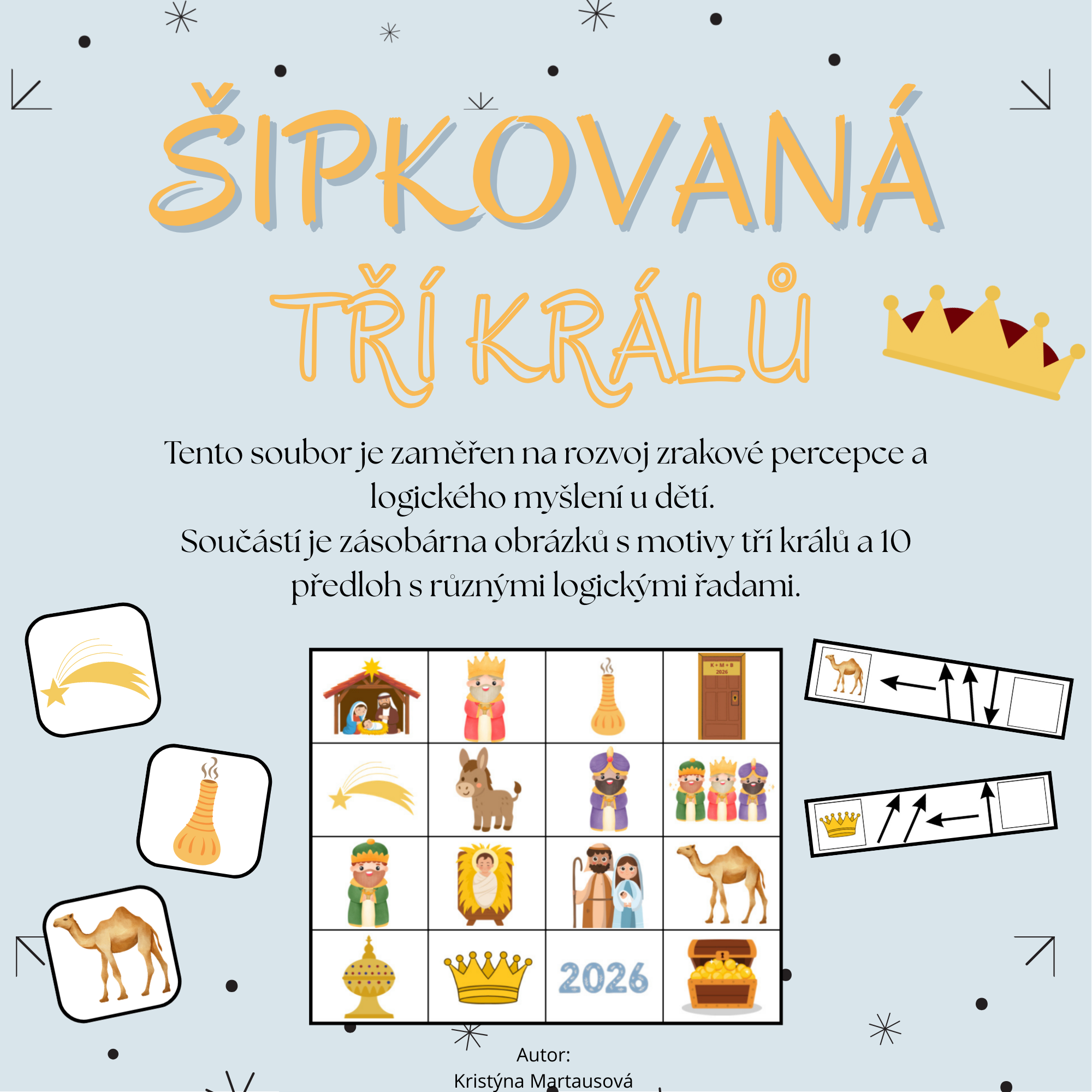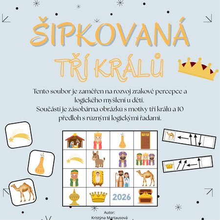 Materiál obsahuje zásobárnu obrázků s motivy tří králů v přehledné mřížce a 10 předloh s různými logickými úlohami. Děti začínají na startovním obrázku a na základě sekvence směrových šipek se pohybují po tabulce. Jejich cílem je najít správný obrázek, na který je šipky dovedly, a tím dokončit logickou řadu.