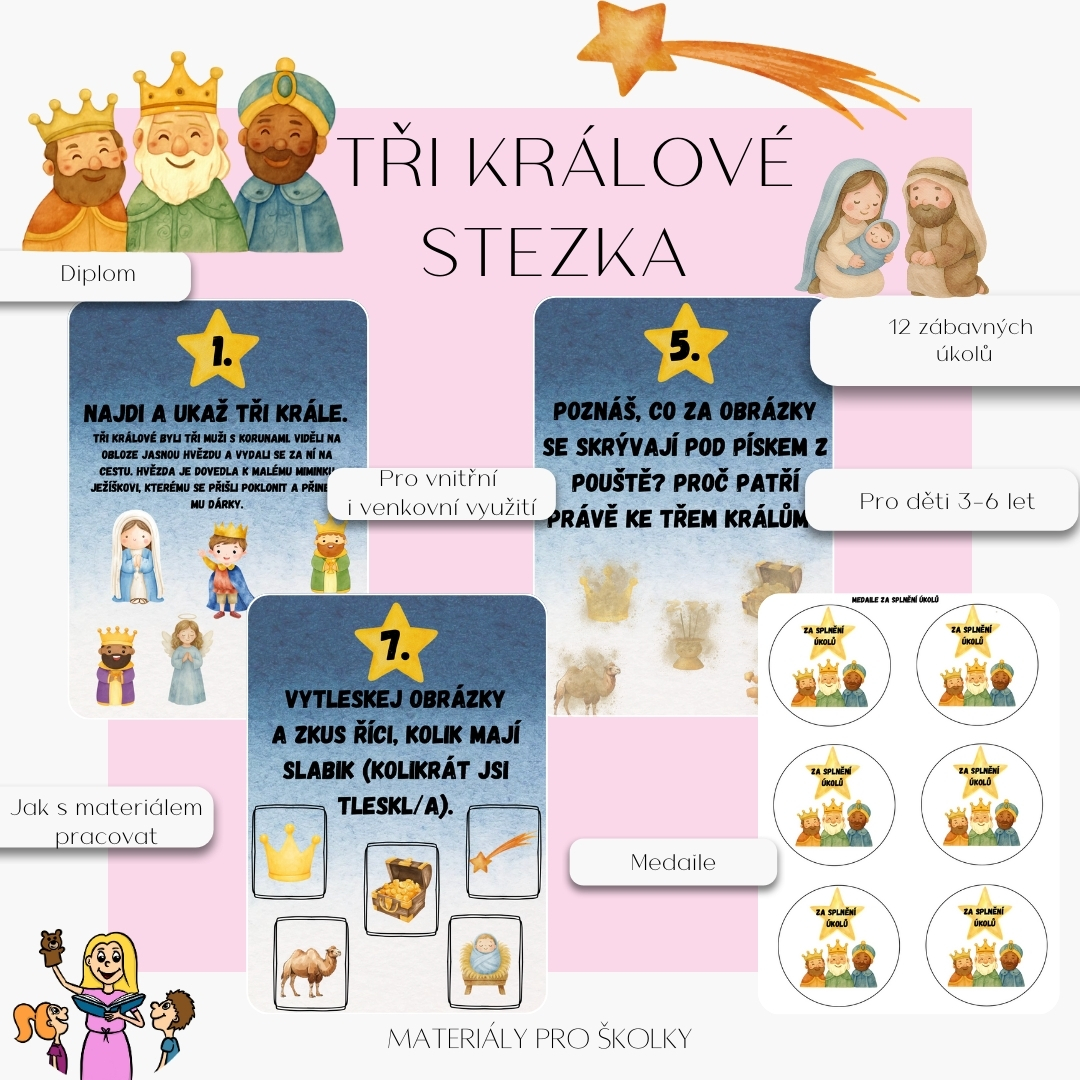 Stezka začíná krátkým úvodem do příběhu Tří králů, aby děti pochopily, o koho se jedná, a postupně je provází cestou za hvězdou až k betlému. Objevují se zde motivy jako Tři králové, kometa, dary, velbloud, Ježíšek, Marie a Josef.