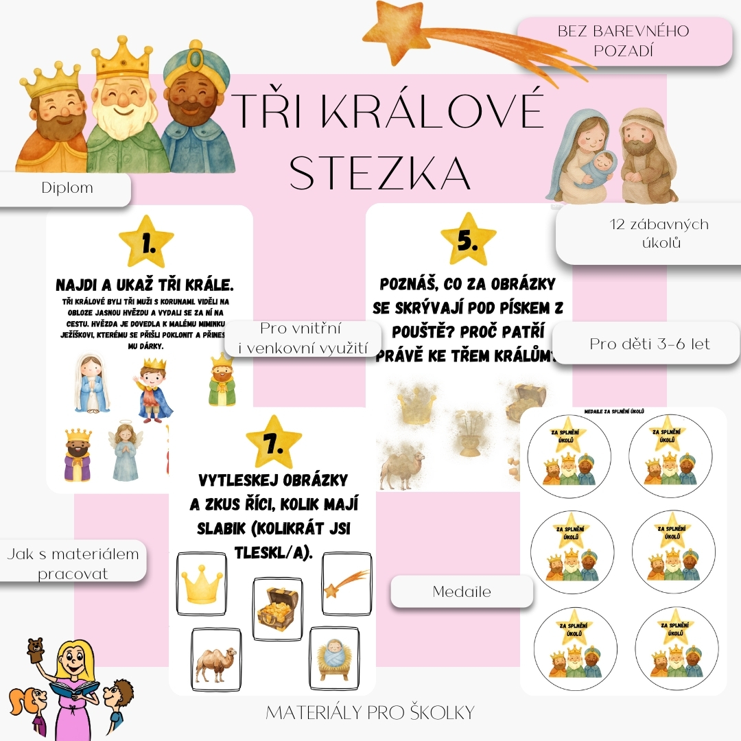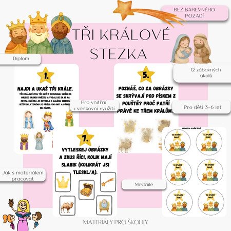 Stezka začíná krátkým úvodem do příběhu tří králů, aby děti pochopily, o koho se jedná, a postupně je provází cestou za hvězdou až k betlému. Objevují se zde motivy jako tři králové, kometa, dary, velbloud, Ježíšek, Marie a Josef.