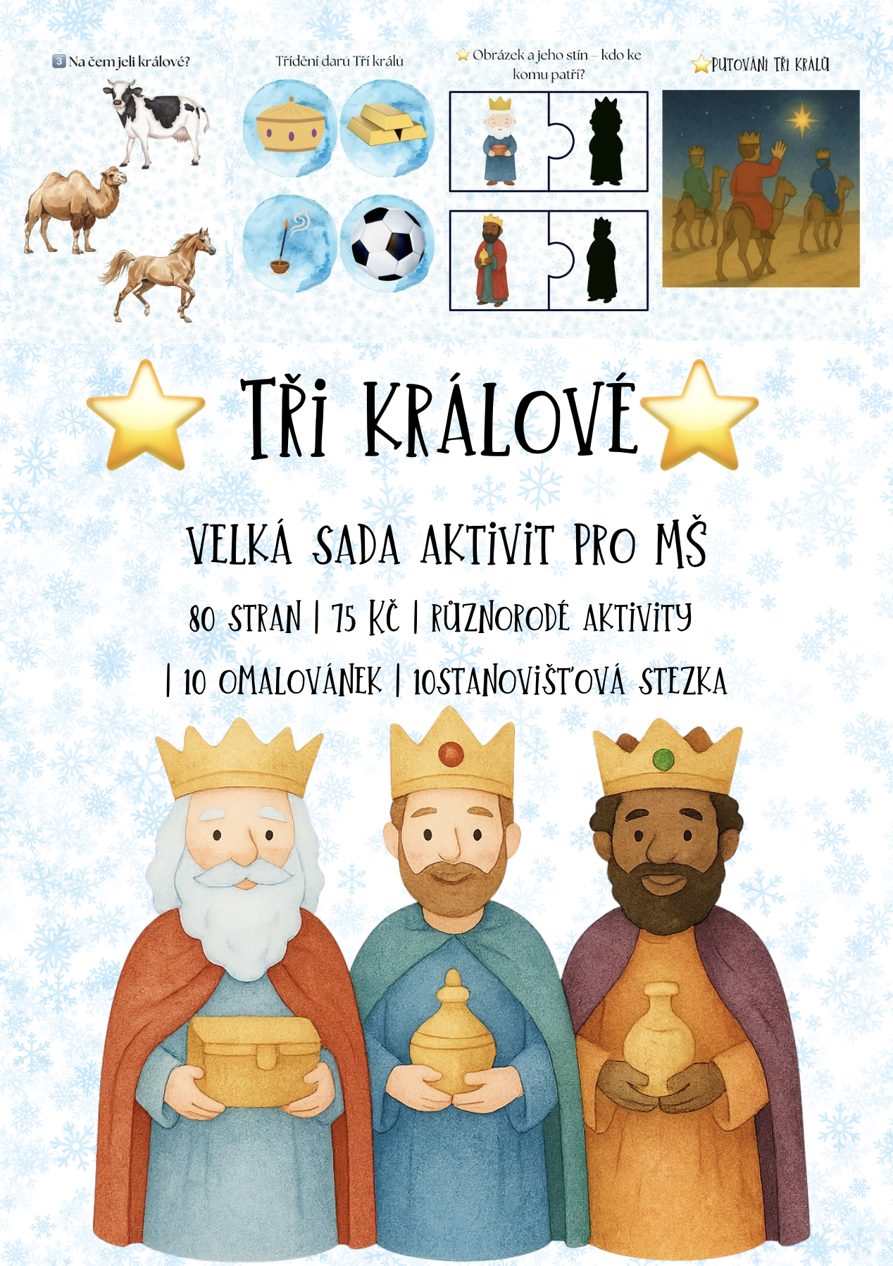 Představujeme obsáhlou a pečlivě zpracovanou vzdělávací sadu na téma Tří králů, vytvořenou speciálně pro děti v mateřské škole. Materiál obsahuje 82 stran plných příběhů, úkolů, her a aktivit, které dětem hravou formou přiblíží tradici Tří králů, podporují rozvoj jejich dovedností a zároveň udrží jejich pozornost a zájem.