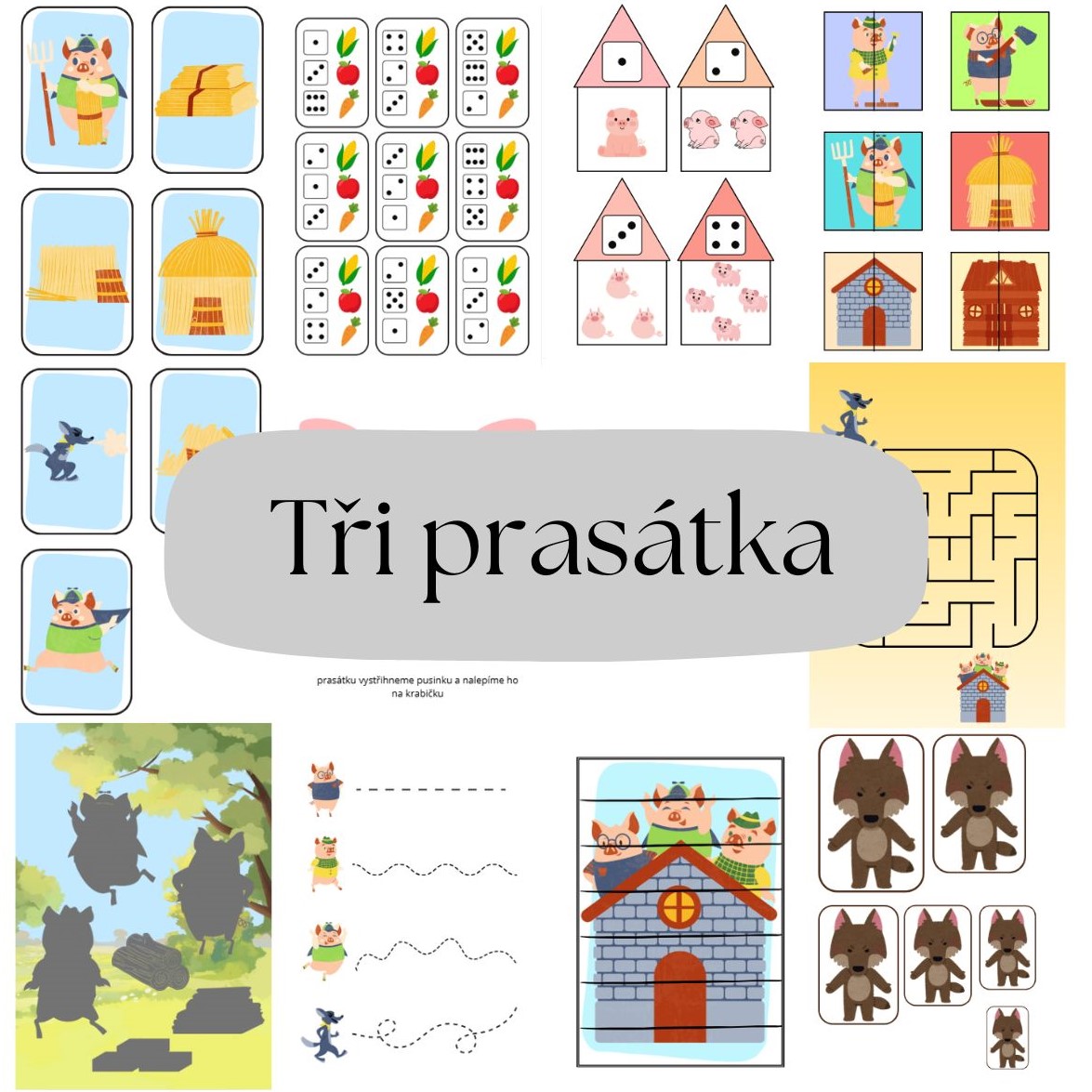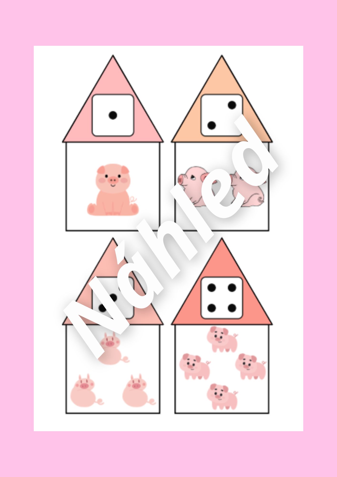 - Domečky s prasátky - počty - odstřihneme od domečků střechy, děti poté hledají stejný počet prasátek a puntíků, tím skládají domečky
