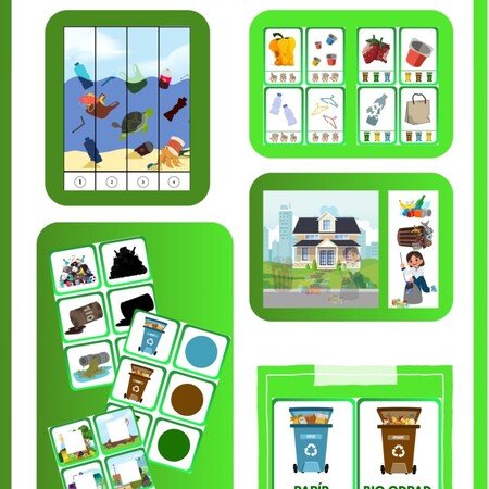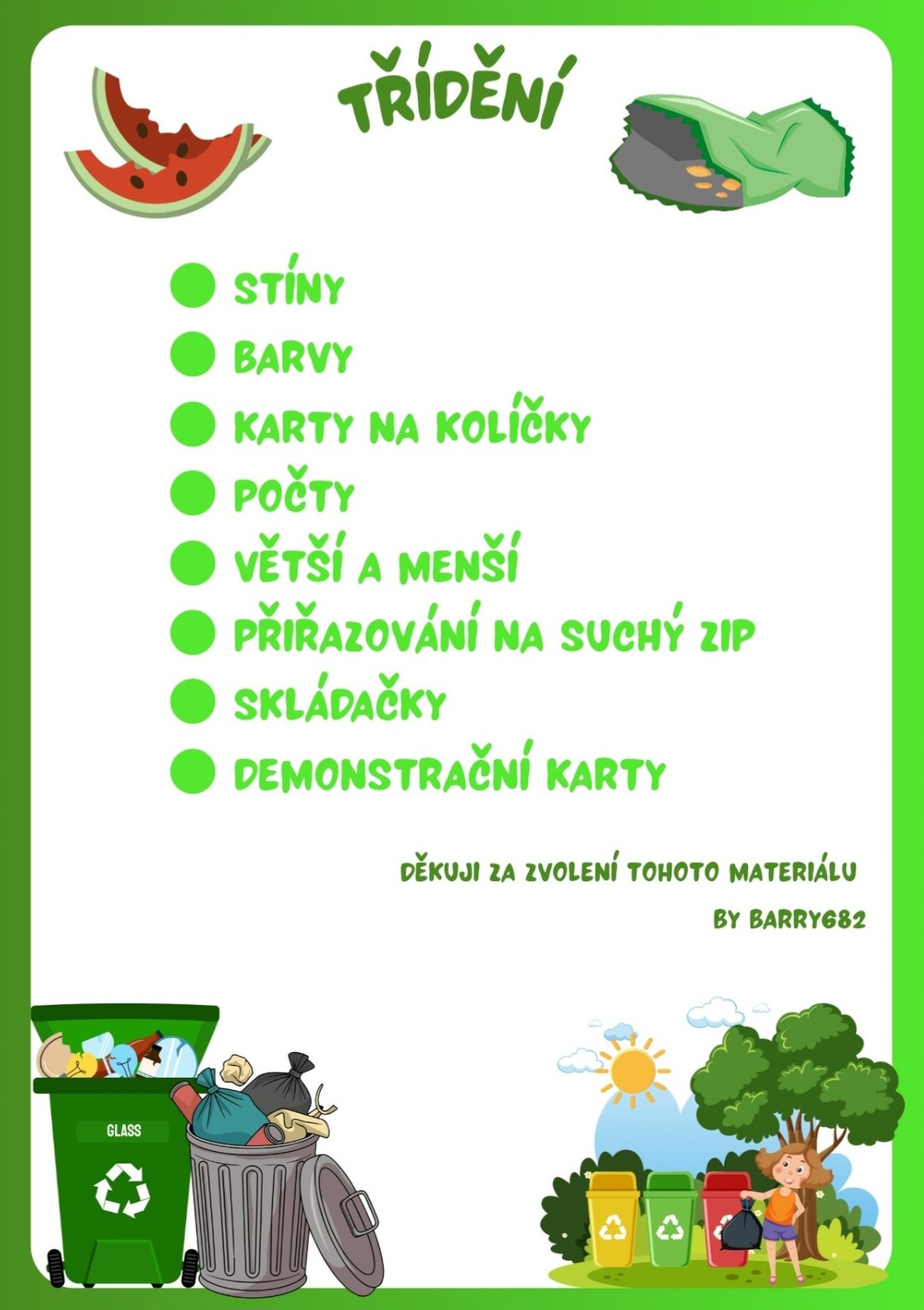 Soubor obsahuje přiřazován barev, stínů a spojování rozdělených obrázků. Přiřazování se suchým zipem na stíny a chybějící části daných obrázků. Kolíčkování na třídění odpadu a počty za využití obrázků ruky. Skládání velkého obrázku a demonstrační karty.