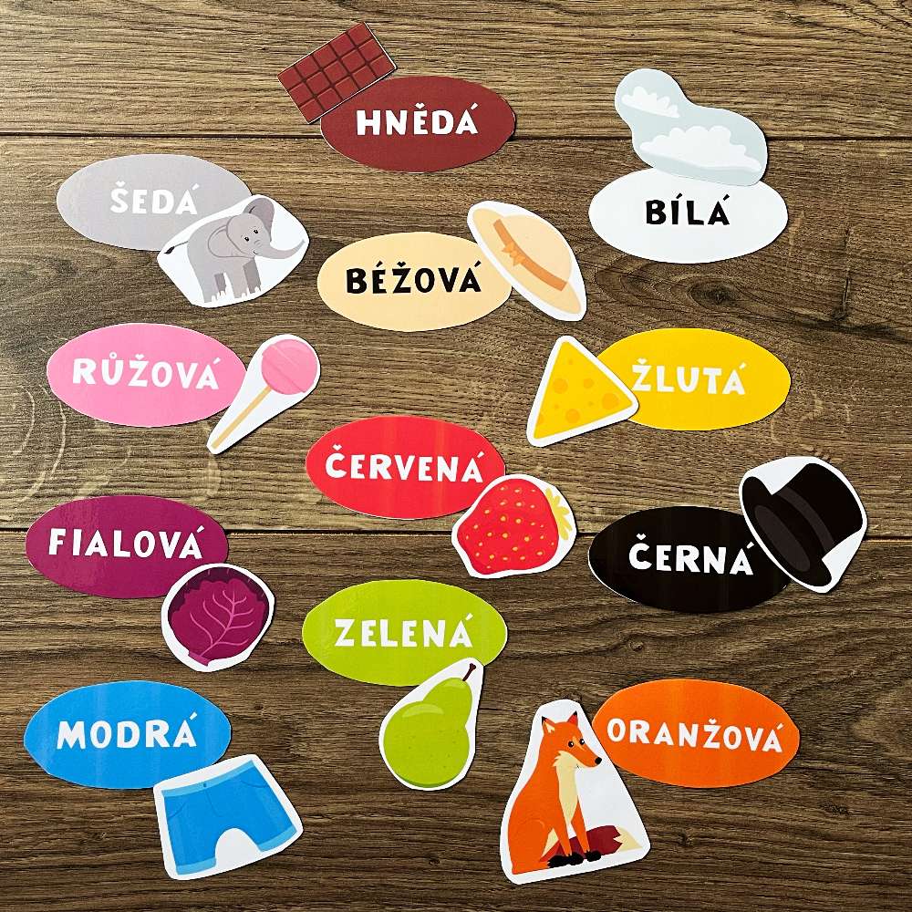 Procvičte si s dětmi barvičky. Úkolem je přiřadit vystřižené obrázky ke správným barevným nápisům. Nápisy jsou k dispozici i v anglickém jazyce.