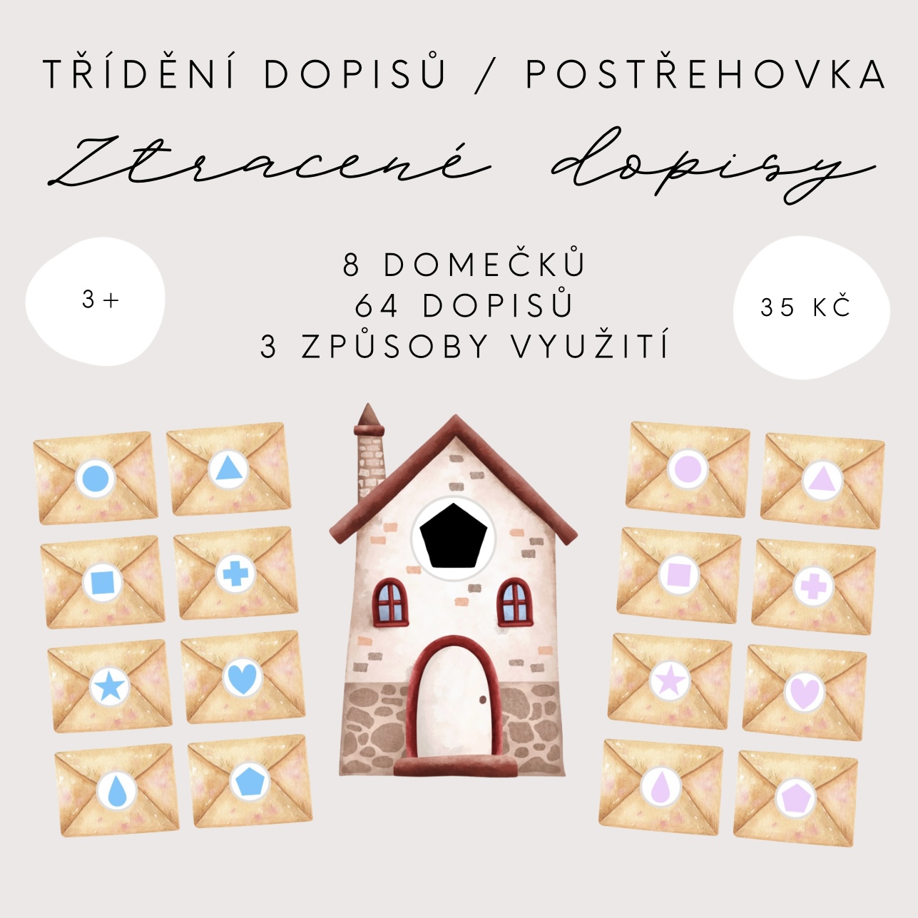V souboru naleznete 8 domečků a 64 dopisů, které jsou označeny různě barevnými geometrickými tvary. Stejné symboly najdete i na domečcích, díky čemuž mohou děti správně přiřazovat jednotlivé dopisy.