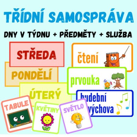 Materiál obsahuje:5 plakátů na dny v týdnu12 plakátů na jednotlivé předměty8 plakátů na třídní službu